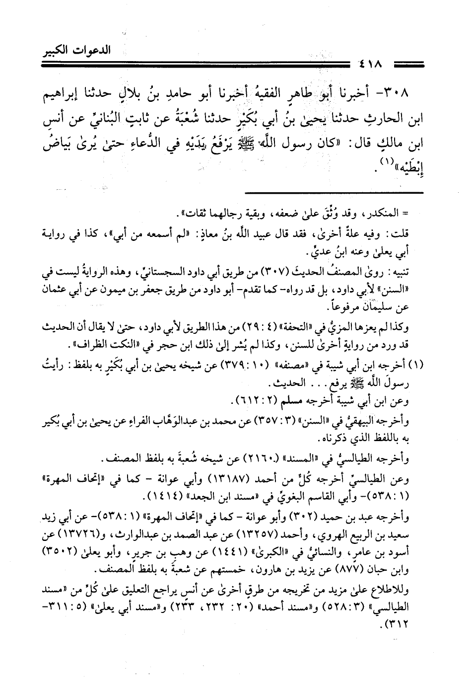 308 - أَخْبَرَنَا أَبُو طَاهِرٍ الْفَقِيهُ، أَخْبَرَنَا أَبُو حَامِدِ بْنُ بِلَالٍ، حَدَّثَنَا إِبْرَاهِيمُ بْنُ الْحَارِثِ، حَدَّثَنَا يَحْيَى بْنُ أَبِي بُكَيْرٍ، حَدَّثَنَا شُعْبَةُ، عَنْ ثَابِتِ الْبُنَانِيِّ، عَنْ أَنَسِ بْنِ مَالِكٍ، قَالَ: كَانَ رَسُولُ اللَّهِ صَلَّى اللهُ عَلَيْهِ وَسَلَّمَ §«يَرْفَعُ يَدَيْهِ فِي الدُّعَاءِ حَتَّى يُرَى بَيَاضُ إِبْطَيْهِ»