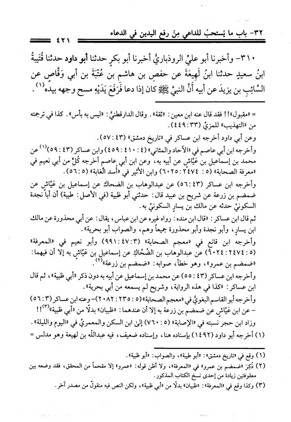 310 - أَخْبَرَنَا أَبُو عَلِيٍّ الرُّوذْبَارِيُّ، أَخْبَرَنَا أَبُو بَكْرٍ، حَدَّثَنَا أَبُو دَاوُدَ، حَدَّثَنَا قُتَيْبَةُ بْنُ سَعِيدٍ، حَدَّثَنَا ابْنُ لَهِيعَةَ، عَنْ حَفْصِ بْنِ هَاشِمِ بْنِ عُتْبَةَ بْنِ أَبِي وَقَّاصٍ، عَنِ السَّائِبِ بْنِ يَزِيدَ، عَنْ أَبِيهِ، أَنَّ النَّبِيَّ صَلَّى اللهُ عَلَيْهِ وَسَلَّمَ كَانَ §«إِذَا دَعَا فَرَفَعَ يَدَيْهِ مَسَحَ وَجْهَهُ بِيَدَيْهِ»