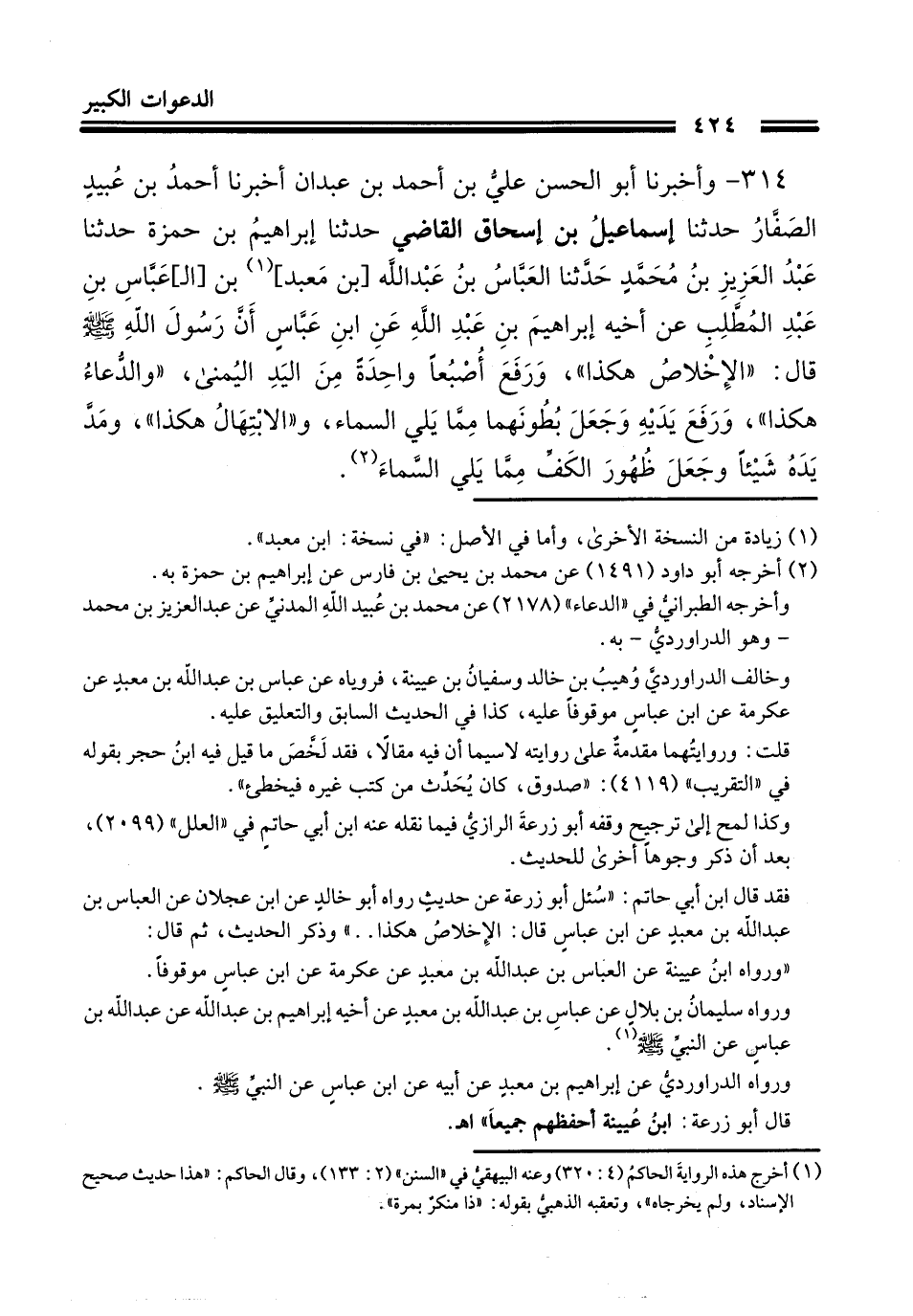 314 - وَأَخْبَرَنَا أَبُو الْحَسَنِ عَلِيُّ بْنُ أَحْمَدَ بْنِ عَبْدَانَ , أَخْبَرَنَا أَحْمَدُ بْنُ عُبَيْدِ الصَّفَّارُ , حَدَّثَنَا إِسْمَاعِيلُ بْنُ إِسْحَاقَ الْقَاضِي , حَدَّثَنَا إِبْرَاهِيمُ بْنُ حَمْزَةَ , حَدَّثَنَا عَبْدُ الْعَزِيزِ بْنُ مُحَمَّدٍ , حَدَّثَنَا الْعَبَّاسُ بْنُ عَبْدِ اللَّهِ بْنِ مَعْبَدِ بْنِ الْعَبَّاسِ بْنِ عَبْدِ الْمُطَّلِبِ , عَنْ أَخِيهِ , إِبْرَاهِيمَ بْنِ عَبْدِ اللَّهِ , عَنِ ابْنِ عَبَّاسٍ , أَنَّ رَسُولَ اللَّهِ صَلَّى اللهُ عَلَيْهِ وَسَلَّمَ قَالَ: «الْإِخْلَاصُ هَكَذَا» ، وَرَفَعَ أُصْبُعًا وَاحِدَةً مِنَ الْيَدِ الْيُمْنَى، §«وَالدُّعَاءُ هَكَذَا» وَرَفَعَ يَدَيْهِ وَجَعَلَ بُطُونَهُمَا مِمَّا يَلِي السَّمَاءَ «وَالِابْتِهَالُ هَكَذَا» وَمَدَّ يَدَهُ شَيْئًا وَجَعَلَ ظُهُورَ الْكَفِّ مِمَّا يَلِي السَّمَاءَ