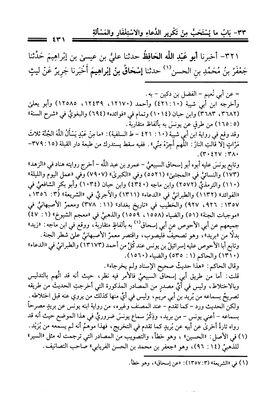 321 - أَخْبَرَنَا أَبُو عَبْدِ اللَّهِ الْحَافِظُ، حَدَّثَنَا عَلِيُّ بْنُ عِيسَى بْنِ إِبْرَاهِيمَ، حَدَّثَنَا جَعْفَرُ بْنُ مُحَمَّدِ بْنِ الْحُسَيْنِ، حَدَّثَنَا إِسْحَاقُ بْنُ إِبْرَاهِيمَ، أَخْبَرَنَا جَرِيرٌ، عَنْ لَيْثٍ، عَنْ يُونُسَ، عَنْ أَبِي حَازِمٍ، عَنْ أَبِي هُرَيْرَةَ، قَالَ: قَالَ رَسُولُ اللَّهِ صَلَّى اللهُ عَلَيْهِ وَسَلَّمَ: §" مَا اسْتَجَارَ عَبْدٌ مِنَ النَّارِ سَبْعَ مَرَّاتٍ إِلَّا قَالَتِ النَّارُ: رَبِّ، إِنَّ عَبْدَكَ فُلَانًا قَدِ اسْتَجَارَكَ مِنِّي فَأَجِرْهُ. وَلَا سَأَلَ عَبْدٌ الْجَنَّةَ فِي يَوْمٍ سَبْعَ مَرَّاتٍ إِلَّا قَالَتِ الْجَنَّةُ: رَبِّ إِنَّ عَبْدَكَ فُلَانًا قَدْ سَأَلَنِي فَأَدْخِلْهُ "