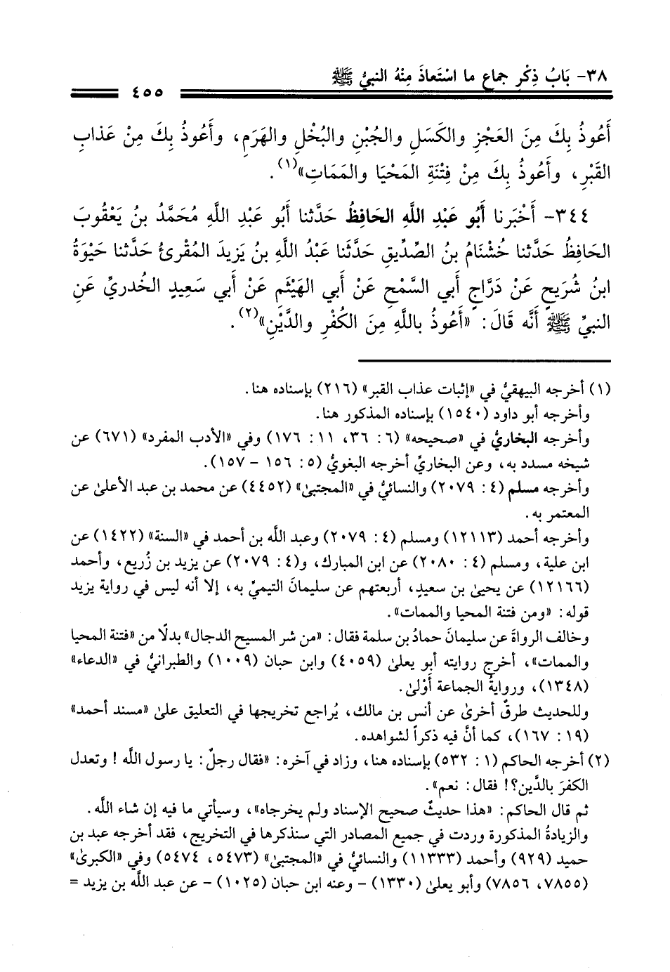 344 - أَخْبَرَنَا أَبُو عَبْدِ اللَّهِ الْحَافِظُ، حَدَّثَنَا أَبُو عَبْدِ اللَّهِ مُحَمَّدُ بْنُ يَعْقُوبَ الْحَافِظُ، حَدَّثَنَا خَشْنَامُ بْنُ الصِّدِّيقِ، حَدَّثَنَا عَبْدُ اللَّهِ بْنُ يَزِيدَ الْمُقْرِئُ، حَدَّثَنَا حَيْوَةُ بْنُ شُرَيْحٍ، عَنْ دَرَّاجٍ أَبِي السَّمْحِ، عَنْ أَبِي الْهَيْثَمِ، عَنْ أَبِي سَعِيدٍ الْخُدْرِيِّ، عَنِ النَّبِيِّ صَلَّى اللهُ عَلَيْهِ وَسَلَّمَ أَنَّهُ قَالَ: §«أَعُوذُ بِاللَّهِ مِنَ الْكُفْرِ وَالدَّيْنِ»
