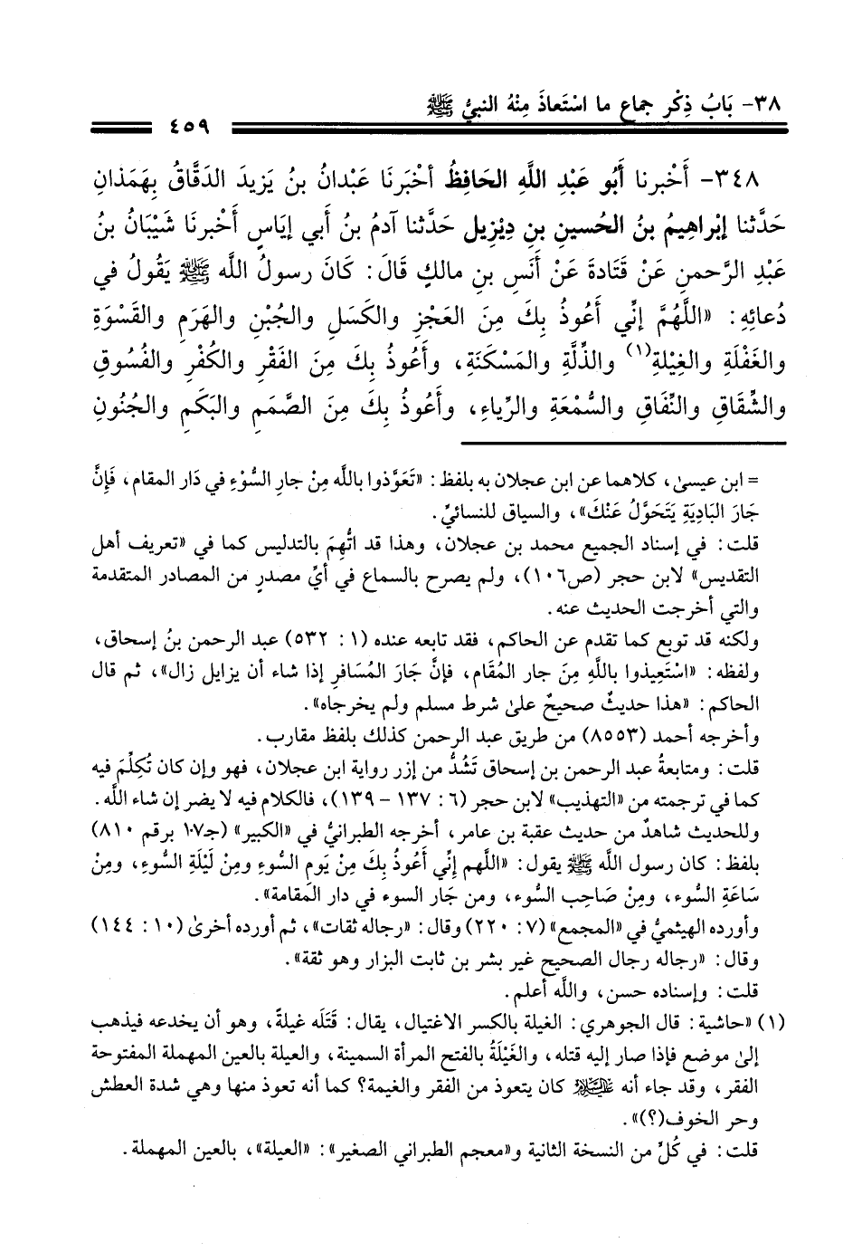348 - أَخْبَرَنَا أَبُو عَبْدِ اللَّهِ الْحَافِظُ، أَخْبَرَنَا عَبْدَانُ بْنُ يَزِيدَ الدَّقَّاقُ، بِهَمَذَانَ، حَدَّثَنَا إِبْرَاهِيمُ بْنُ الْحُسَيْنِ بْنِ دِيزِيلَ، حَدَّثَنَا آدَمُ بْنُ أَبِي إِيَاسٍ، أَخْبَرَنَا شَيْبَانُ بْنُ عَبْدِ الرَّحْمَنِ، عَنْ قَتَادَةَ، عَنْ أَنَسِ بْنِ مَالِكٍ، قَالَ: كَانَ رَسُولُ اللَّهِ صَلَّى اللهُ عَلَيْهِ وَسَلَّمَ يَقُولُ فِي دُعَائِهِ: «§اللَّهُمَّ إِنِّي أَعُوذُ بِكَ مِنَ الْعَجْزِ وَالْكَسَلِ، وَالْجُبْنِ وَالْهَرَمِ، وَالْقَسْوَةِ وَالْغَفْلَةِ، وَالْعَيْلَةِ وَالذِّلَّةِ وَالْمَسْكَنَةِ، وَأَعُوذُ بِكَ مِنَ الْفَقْرِ، وَالْكُفْرِ، وَالْفُسُوقِ، وَالشِّقَاقِ، وَالنِّفَاقِ، وَالسُّمْعَةِ، وَالرِّيَاءِ، وَأَعُوذُ بِكَ مِنَ الصَّمَمِ، وَالْبَكَمِ، وَالْجُنُونِ، وَالْجُذَامِ، وَالْبَرَصِ، وَسَيِّئِ الْأَسْقَامِ»