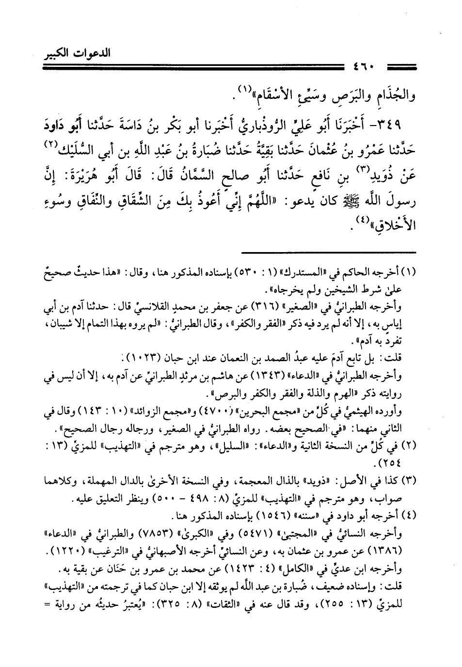349 - أَخْبَرَنَا أَبُو عَلِيٍّ الرُّوذْبَارِيُّ، أَخْبَرَنَا أَبُو بَكْرِ بْنُ دَاسَةَ، حَدَّثَنَا أَبُو دَاوُدَ، حَدَّثَنَا عَمْرُو بْنُ عُثْمَانَ، حَدَّثَنَا بَقِيَّةُ، حَدَّثَنَا ضُبَارَةُ بْنُ عَبْدِ اللَّهِ بْنِ أَبِي السُّلَيْكِ، عَنْ دُوَيْدِ بْنِ نَافِعٍ، حَدَّثَنَا أَبُو صَالِحٍ السَّمَّانُ، قَالَ: قَالَ أَبُو هُرَيْرَةَ: إِنَّ رَسُولَ اللَّهِ صَلَّى اللهُ عَلَيْهِ وَسَلَّمَ كَانَ يَدْعُو: «§اللَّهُمَّ إِنِّي أَعُوذُ بِكَ مِنَ الشِّقَاقِ، وَالنِّفَاقِ، وَسُوءِ الْأَخْلَاقِ»