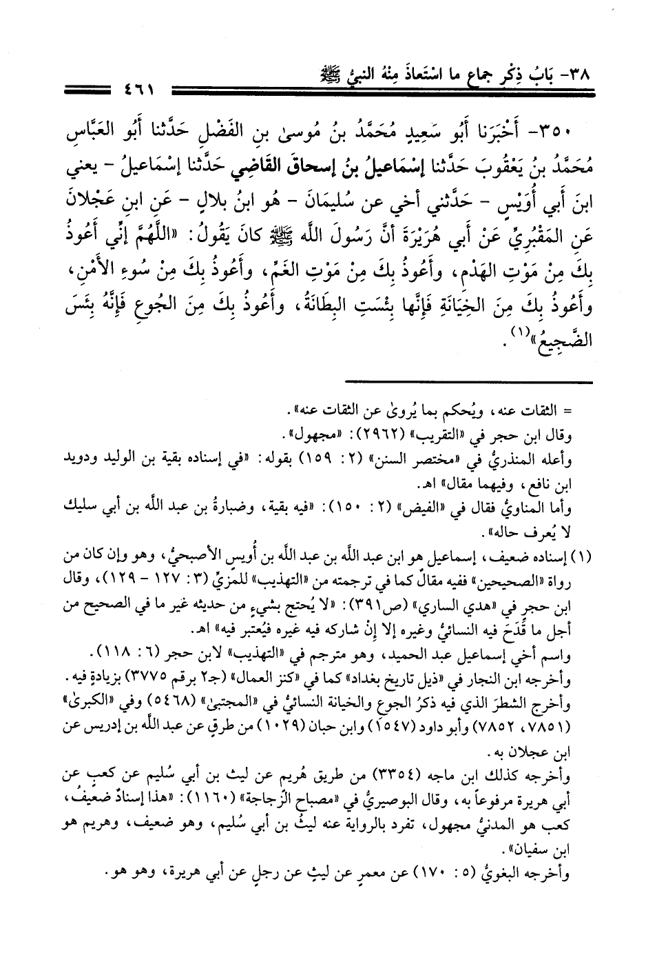 350 - أَخْبَرَنَا أَبُو سَعِيدٍ مُحَمَّدُ بْنُ مُوسَى بْنِ الْفَضْلِ، حَدَّثَنَا أَبُو الْعَبَّاسِ مُحَمَّدُ بْنُ يَعْقُوبَ، حَدَّثَنَا إِسْمَاعِيلُ بْنُ إِسْحَاقَ الْقَاضِي، حَدَّثَنَا إِسْمَاعِيلُ يَعْنِي ابْنَ أَبِي أُوَيْسٍ، حَدَّثَنِي أَخِي، عَنْ سُلَيْمَانَ هُوَ ابْنُ بِلَالٍ، عَنِ ابْنِ عَجْلَانَ، عَنِ الْمَقْبُرِيِّ، عَنْ أَبِي هُرَيْرَةَ، أَنَّ رَسُولَ اللَّهِ صَلَّى اللهُ عَلَيْهِ وَسَلَّمَ كَانَ يَقُولُ: §«اللَّهُمَّ إِنِّي أَعُوذُ بِكَ مِنْ مَوْتِ الْهَدْمِ، وَأَعُوذُ بِكَ مِنْ مَوْتِ الْغَمِّ، وَأَعُوذُ بِكَ مِنْ سُوءِ الْأَمْنِ، وَأَعُوذُ بِكَ مِنَ الْخِيَانَةَ؛ فَإِنَّهَا بِئْسَتِ الْبِطَانَةُ، وَأَعُوذُ بِكَ مِنَ الْجُوعِ فَإِنَّهُ بِئْسَ الضَّجِيعُ»