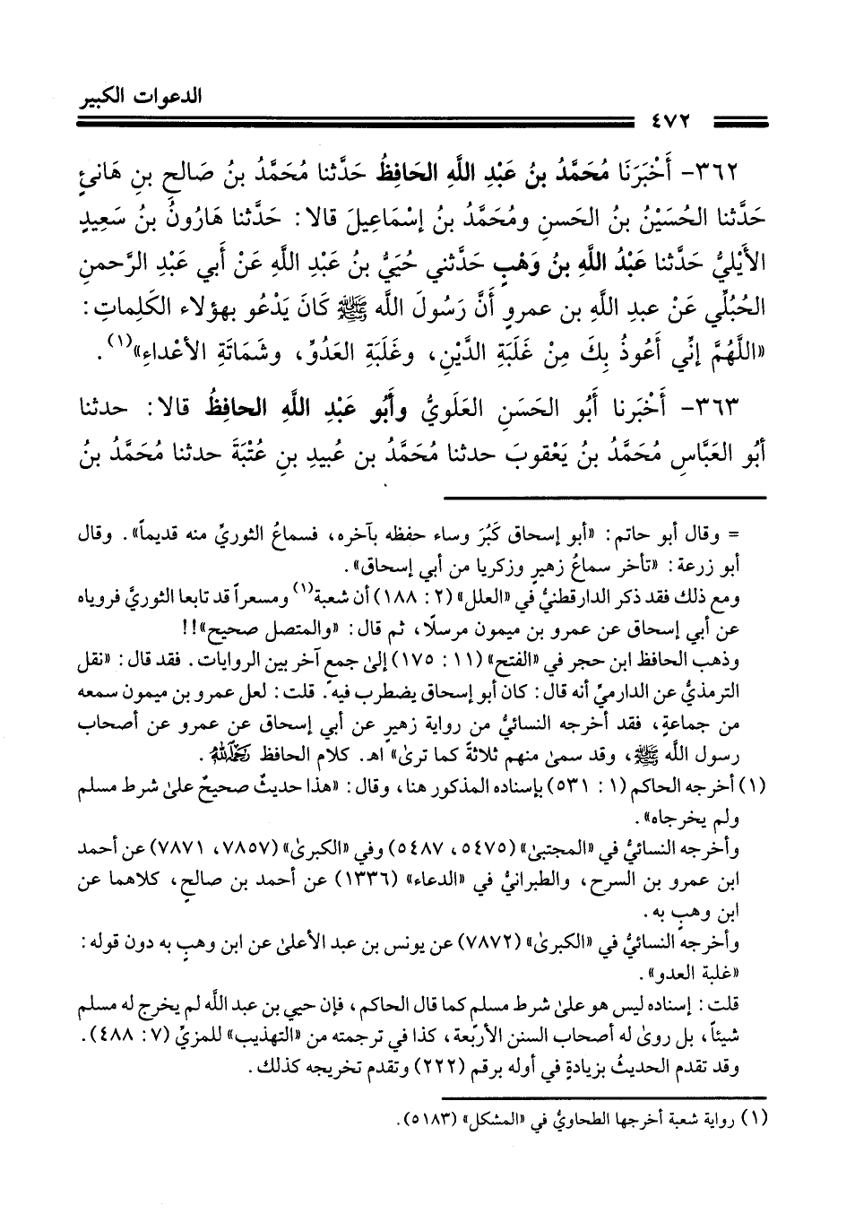 362 - أَخْبَرَنَا مُحَمَّدُ بْنُ عَبْدِ اللَّهِ الْحَافِظُ، حَدَّثَنَا مُحَمَّدُ بْنُ صَالِحِ بْنِ هَانِئٍ، حَدَّثَنَا الْحُسَيْنُ بْنُ الْحَسَنِ، وَمُحَمَّدُ بْنُ إِسْمَاعِيلَ، قَالَا: حَدَّثَنَا هَارُونُ بْنُ سَعِيدٍ الْأَيْلِيُّ، حَدَّثَنَا عَبْدُ اللَّهِ بْنُ وَهْبٍ، حَدَّثَنِي حُيَىُّ بْنُ عَبْدِ اللَّهِ، عَنْ أَبِي عَبْدِ الرَّحْمَنِ الْحُبُلِيِّ، عَنْ عَبْدِ اللَّهِ بْنِ عَمْرٍو، أَنَّ رَسُولَ اللَّهِ صَلَّى اللهُ عَلَيْهِ وَسَلَّمَ كَانَ يَدْعُو بِهَؤُلَاءِ الْكَلِمَاتِ: «§اللَّهُمَّ إِنِّي أَعُوذُ بِكَ مِنْ غَلَبَةِ الدَّيْنِ، وَغَلَبَةِ الْعَدُوِّ، وَشَمَاتَةِ الْأَعْدَاءِ»