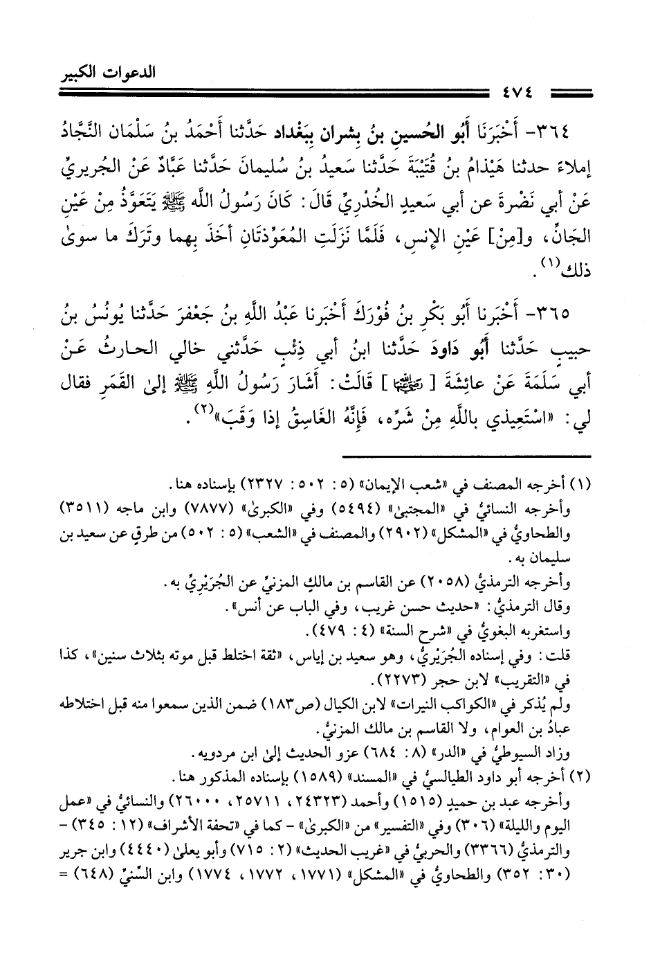364 - أَخْبَرَنَا أَبُو الْحُسَيْنِ بْنُ بِشْرَانَ، بِبَغْدَادَ، حَدَّثَنَا أَحْمَدُ بْنُ سَلْمَانَ النِّجَادُ، إِمْلَاءً، حَدَّثَنَا هَيْذَامُ بْنُ قُتَيْبَةَ، حَدَّثَنَا سَعِيدُ بْنُ سُلَيْمَانَ، حَدَّثَنَا عَبَّادٌ، عَنِ الْجُرَيْرِيِّ، عَنْ أَبِي نَضْرَةَ، عَنْ أَبِي سَعِيدٍ الْخُدْرِيِّ، قَالَ: كَانَ رَسُولُ اللَّهِ صَلَّى اللهُ عَلَيْهِ وَسَلَّمَ: «§يَتَعَوَّذُ مِنْ عَيْنِ الْجَانِّ، وَمِنْ عَيْنِ الْإِنْسِ، فَلَمَّا نَزَلَتِ الْمُعَوِّذَتَانِ أَخَذَ بِهِمَا وَتَرَكَ مَا سِوَى ذَلِكَ»