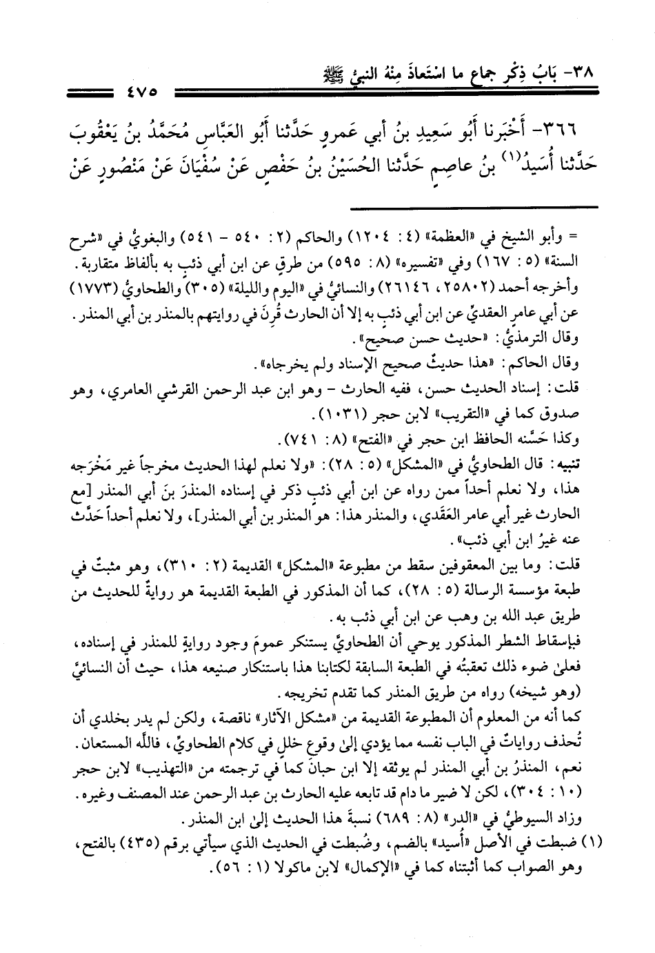 366 - أَخْبَرَنَا أَبُو سَعِيدِ بْنُ أَبِي عَمْرٍو، حَدَّثَنَا أَبُو الْعَبَّاسِ مُحَمَّدُ بْنُ يَعْقُوبَ، حَدَّثَنَا أُسَيْدُ بْنُ عَاصِمٍ، حَدَّثَنَا الْحُسَيْنُ بْنُ حَفْصٍ، عَنْ سُفْيَانَ، عَنْ مَنْصُورٍ، عَنْ مُجَاهِدٍ، قَالَ: «كَانَ النَّبِيُّ صَلَّى اللهُ عَلَيْهِ وَسَلَّمَ §يَتَعَوَّذُ مِنْ غَلَبَةِ الْعَدُوِّ، وَمِنْ غَلَبَةِ الدَّيْنِ، وَمِنْ بَوَارِ الْإِثْمِ» . هَذَا مُنْقَطِعٌ