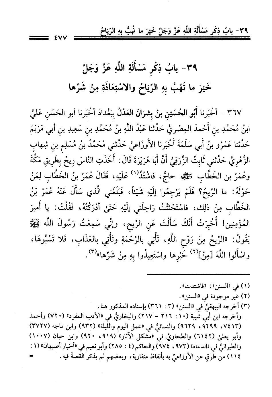 367 - أَخْبَرَنَا أَبُو الْحُسَيْنِ بْنُ بِشْرَانَ الْعَدْلُ، بِبَغْدَادَ أَخْبَرَنَا أَبُو الْحَسَنِ عَلِيُّ بْنُ مُحَمَّدِ بْنِ أَحْمَدَ الْمِصْرِيُّ، حَدَّثَنَا عَبْدُ اللَّهِ بْنُ مُحَمَّدِ بْنِ سَعِيدِ بْنِ أَبِي مَرْيَمَ، حَدَّثَنَا عَمْرُو بْنُ أَبِي سَلَمَةَ، أَخْبَرَنَا الْأَوْزَاعِيُّ، حَدَّثَنِي مُحَمَّدُ بْنُ مُسْلِمِ بْنِ شِهَابٍ الزُّهْرِيُّ، حَدَّثَنِي ثَابِتٌ الزُّرَقِيُّ، أَنَّ أَبَا هُرَيْرَةَ قَالَ: أَخَذَتِ النَّاسَ رِيحٌ بِطَرِيقِ مَكَّةَ، وَعُمَرُ بْنُ الْخَطَّابِ رَضِيَ اللَّهُ عَنْهُ حَاجٌّ، فَاشْتَدَّتْ عَلَيْهِ، فَقَالَ عُمَرُ بْنُ الْخَطَّابِ لِمَنْ حَوْلَهُ: مَا الرِّيحُ؟ فَلَمْ يَرْجِعُوا إِلَيْهِ شَيْئًا، فَبَلَغَنِي الَّذِي سَأَلَ عَنْهُ عُمَرُ بْنُ الْخَطَّابِ مِنْ ذَلِكَ، فَاسْتَحْثَثْتُ رَاحِلَتِي إِلَيْهِ حَتَّى أَدْرَكْتُهُ، فَقُلْتُ: يَا أَمِيرَ الْمُؤْمِنِينَ أُخْبِرْتُ أَنَّكَ سَأَلْتَ عَنِ الرِّيحِ، وَإِنِّي سَمِعْتُ رَسُولَ اللَّهِ صَلَّى اللهُ عَلَيْهِ وَسَلَّمَ يَقُولُ: «§الرِّيحُ مِنْ رَوْحِ اللَّهِ، تَأْتِي بِالرَّحْمَةِ، وَتَأْتِي بِالْعَذَابِ، فَلَا تَسُبُّوهَا، وَاسْأَلُوا اللَّهَ مِنْ خَيْرِهَا، وَاسْتَعِيذُوا بِهِ مِنْ شَرِّهَا»