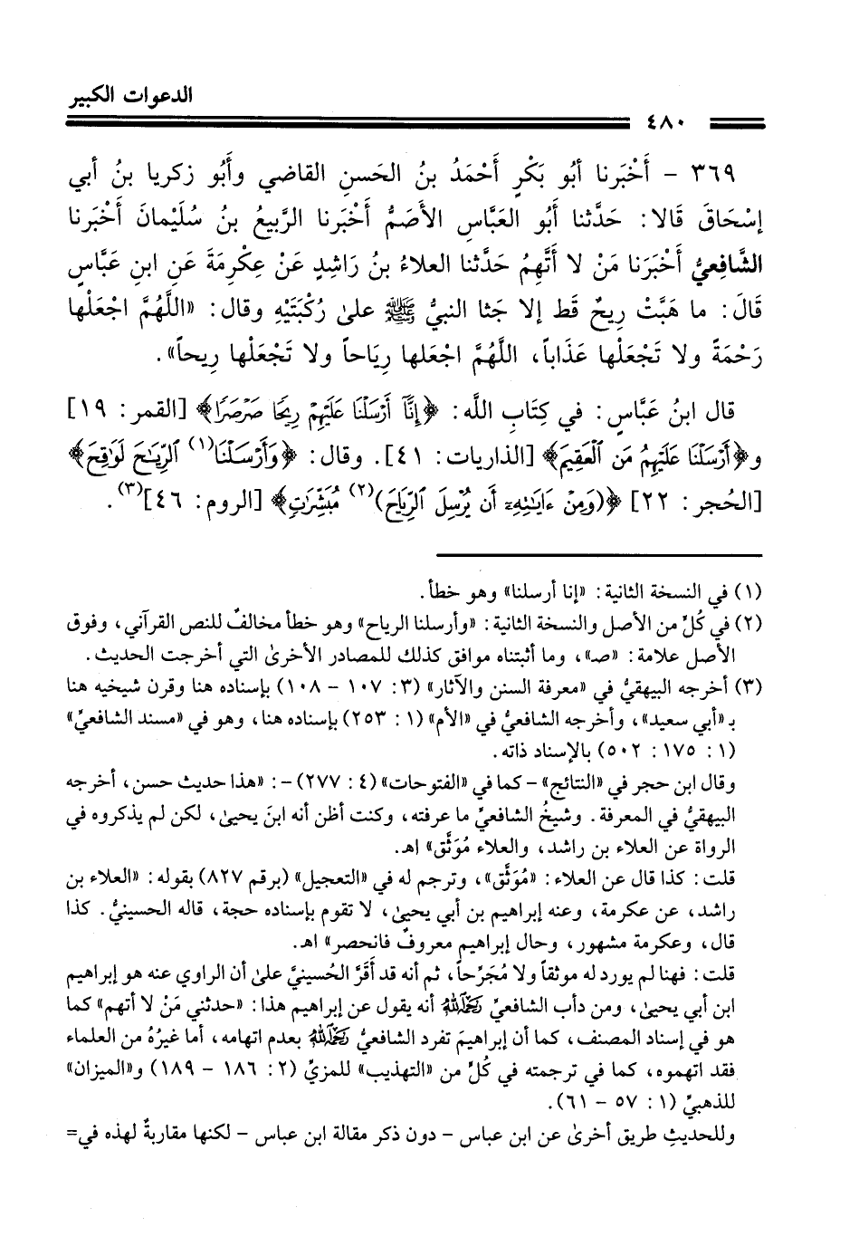 369 - أَخْبَرَنَا أَبُو بَكْرٍ أَحْمَدُ بْنُ الْحَسَنِ الْقَاضِي، وَأَبُو زَكَرِيَّا بْنُ أَبِي إِسْحَاقَ قَالَا: حَدَّثَنَا أَبُو الْعَبَّاسِ الْأَصَمُّ، أَخْبَرَنَا الرَّبِيعُ بْنُ سُلَيْمَانَ، أَخْبَرَنَا الشَّافِعِيُّ، أَخْبَرَنَا مَنْ لَا أَتَّهِمُ، حَدَّثَنَا الْعَلَاءُ بْنُ رَاشِدٍ، عَنْ عِكْرِمَةَ، عَنِ ابْنِ عَبَّاسٍ، قَالَ: مَا هَبَّتْ رِيحٌ قَطُّ إِلَّا جَثَا النَّبِيُّ صَلَّى اللهُ عَلَيْهِ وَسَلَّمَ عَلَى رُكْبَتَيْهِ وَقَالَ: «§اللَّهُمَّ اجْعَلْهَا رَحْمَةً وَلَا تَجْعَلْهَا عَذَابًا، اللَّهُمَّ اجْعَلْهَا رِيَاحًا وَلَا تَجْعَلْهَا رِيحًا» قَالَ ابْنُ عَبَّاسٍ: فِي كِتَابِ اللَّهِ {أَرْسَلْنَا عَلَيْهِمْ رِيحًا صَرْصَرًا} [القمر: 19] وَ {أَرْسَلْنَا عَلَيْهِمُ الرِّيحَ الْعَقِيمَ} [الذاريات: 41] وَقَالَ: إِنَّا {أَرْسَلْنَا الرِّيَاحَ لَوَاقِحَ} [الحجر: 22] وَأَرْسَلْنَا {الرِّيَاحَ مُبَشِّرَاتٍ} [الروم: 46]