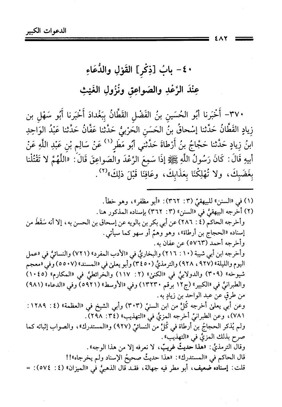 370 - أَخْبَرَنَا أَبُو الْحُسَيْنِ بْنُ الْفَضْلِ الْقَطَّانُ، بِبَغْدَادَ، أَخْبَرَنَا أَبُو سَهْلِ بْنُ زِيَادٍ الْقَطَّانُ، حَدَّثَنَا إِسْحَاقُ بْنُ الْحَسَنِ الْحَرْبِيُّ، حَدَّثَنَا عَفَّانُ، حَدَّثَنَا عَبْدُ الْوَاحِدِ بْنُ زِيَادٍ، حَدَّثَنَا حَجَّاجُ بْنُ أَرْطَاةَ، حَدَّثَنِي أَبُو مَطَرٍ، عَنْ سَالِمِ بْنِ عَبْدِ اللَّهِ، عَنْ أَبِيهِ، قَالَ: كَانَ رَسُولُ اللَّهِ صَلَّى اللهُ عَلَيْهِ وَسَلَّمَ إِذَا سَمِعَ الرَّعْدَ وَالصَّوَاعِقَ قَالَ: «§اللَّهُمَّ لَا تَقْتُلْنَا بِغَضَبِكَ، وَلَا تُهْلِكْنَا بِعَذَابِكَ، وَعَافِنَا قَبْلَ ذَلِكَ»