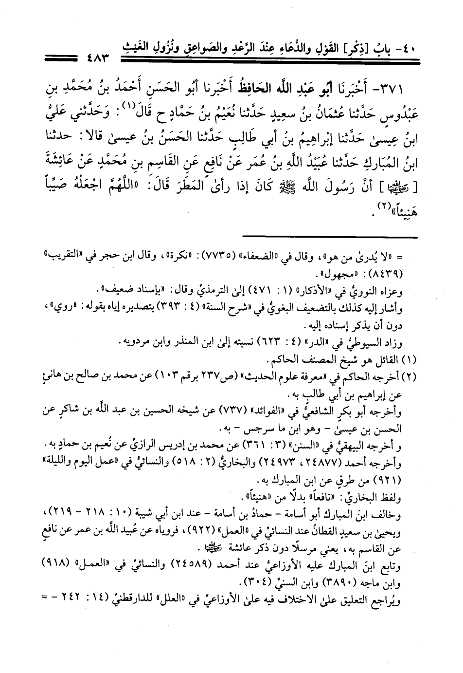 371 - أَخْبَرَنَا أَبُو عَبْدِ اللَّهِ الْحَافِظُ، أَخْبَرَنَا أَبُو الْحَسَنِ أَحْمَدُ بْنُ مُحَمَّدِ بْنِ عَبْدُوسٍ، حَدَّثَنَا عُثْمَانُ بْنُ سَعِيدٍ، حَدَّثَنَا نُعَيْمُ بْنُ حَمَّادٍ، ح قَالَ: وَحَدَّثَنِي عَلِيُّ بْنُ عِيسَى، حَدَّثَنَا إِبْرَاهِيمُ بْنُ أَبِي طَالِبٍ، حَدَّثَنَا الْحَسَنُ بْنُ عِيسَى، قَالَا: حَدَّثَنَا ابْنُ الْمُبَارَكِ، حَدَّثَنَا عُبَيْدُ اللَّهِ بْنُ عُمَرَ، عَنْ نَافِعٍ، عَنِ الْقَاسِمِ بْنِ مُحَمَّدٍ، عَنْ عَائِشَةَ رَضِيَ اللَّهُ عَنْهَا، أَنَّ رَسُولَ اللَّهِ صَلَّى اللهُ عَلَيْهِ وَسَلَّمَ كَانَ إِذَا رَأَى الْمَطَرَ قَالَ: §«اللَّهُمَّ اجْعَلْهُ صَيِّبًا هَنِيئًا»