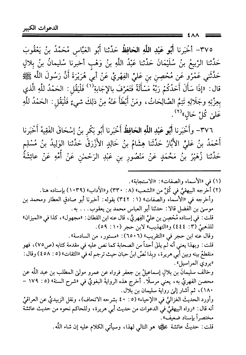 375 - أَخْبَرَنَا أَبُو عَبْدِ اللَّهِ الْحَافِظُ، حَدَّثَنَا أَبُو الْعَبَّاسِ مُحَمَّدُ بْنُ يَعْقُوبَ، حَدَّثَنَا الرَّبِيعُ بْنُ سُلَيْمَانَ، حَدَّثَنَا عَبْدُ اللَّهِ بْنُ وَهْبٍ، حَدَّثَنَا سُلَيْمَانُ بْنُ بِلَالٍ، حَدَّثَنِي عَمْرٌو، عَنْ مِحْصَنِ بْنِ عَلِيٍّ الْفِهْرِيِّ، عَنْ أَبِي هُرَيْرَةَ، أَنَّ رَسُولَ اللَّهِ صَلَّى اللهُ عَلَيْهِ وَسَلَّمَ قَالَ: " §إِذَا سَأَلَ أَحَدُكُمْ رَبَّهُ مَسْأَلَةً فَتَعَرَّفَ الْإِجَابَةَ فَلْيَقُلِ: الْحَمْدُ لِلَّهِ الَّذِي بِعِزَّتِهِ وَجَلَالِهِ تَتِمُّ الصَّالِحَاتُ، وَمَنْ أَبْطَأَ عَنْهُ مِنْ ذَلِكَ شَيْءٌ فَلْيَقُلِ: الْحَمْدُ لِلَّهِ عَلَى كُلِّ حَالٍ "