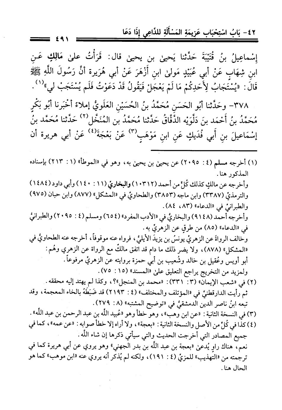 378 - وَحَدَّثَنَا أَبُو الْحَسَنِ مُحَمَّدُ بْنُ الْحُسَيْنِ الْعَلَوِيُّ، إِمْلَاءً، أَخْبَرَنَا أَبُو بَكْرٍ مُحَمَّدُ بْنُ أَحْمَدَ بْنِ دَلُّويَهِ الدَّقَّاقُ، حَدَّثَنَا مُحَمَّدُ بْنُ الْمُنَخَّلِ، حَدَّثَنَا مُحَمَّدُ بْنُ إِسْمَاعِيلَ بْنِ أَبِي فُدَيْكٍ، عَنِ ابْنِ مَوْهَبٍ، عَنْ عَمِّهِ (1) ، عَنْ أَبِي هُرَيْرَةَ، أَنَّ رَسُولَ اللَّهِ صَلَّى اللهُ عَلَيْهِ وَسَلَّمَ قَالَ: §«مَا مِنْ مُسْلِمٍ يَنْصُبُ وَجْهَهُ لِلَّهِ عَزَّ وَجَلَّ يَسْأَلُهُ مَسْأَلَةً إِلَّا أَعْطَاهُ إِيَّاهَا، إِمَّا عَجَّلَهَا فِي الدُّيْنَا، وَإِمَّا ذَخَرَهَا لَهُ فِي الْآخِرَةِ مَا لَمْ يَعْجَلْ» قَالُوا: يَا رَسُولَ اللَّهِ وَمَا عَجَلَتُهُ؟ قَالَ: " يَقُولُ: قَدْ دَعَوْتُ وَدَعَوْتُ فَلَا أُرَاهُ يُسْتَجَابُ لِي «