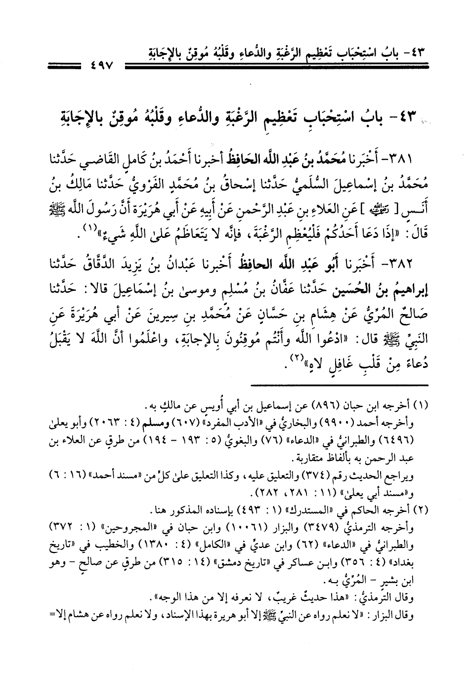 382 - أَخْبَرَنَا أَبُو عَبْدِ اللَّهِ الْحَافِظُ، أَخْبَرَنَا عَبْدَانُ بْنُ يَزِيدَ الدَّقَّاقُ، حَدَّثَنَا إِبْرَاهِيمُ بْنُ الْحُسَيْنِ، حَدَّثَنَا عَفَّانُ بْنُ مُسْلِمٍ، وَمُوسَى بْنُ إِسْمَاعِيلَ، قَالَا: حَدَّثَنَا صَالِحٌ الْمُرِّيُّ، عَنْ هِشَامِ بْنِ حَسَّانَ، عَنْ مُحَمَّدِ بْنِ سِيرِينَ، عَنْ أَبِي هُرَيْرَةَ، عَنِ النَّبِيِّ صَلَّى اللهُ عَلَيْهِ وَسَلَّمَ قَالَ: «§ادْعُوا اللَّهَ وَأَنْتُمْ مُوقِنُونَ بِالْإِجَابَةِ، وَاعْلَمُوا أَنَّ اللَّهَ لَا يَقْبَلُ دُعَاءً مِنْ قَلْبٍ غَافِلٍ لَاهٍ»