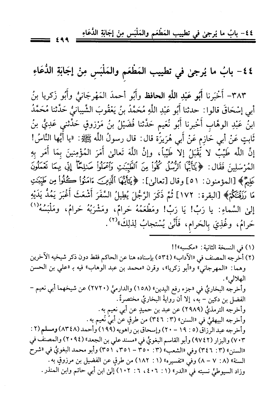 383 - أَخْبَرَنَا أَبُو عَبْدِ اللَّهِ، وَأَبُو أَحْمَدَ الْمِهْرَجَانِيُّ، وَأَبُو زَكَرِيَّا بْنُ أَبِي إِسْحَاقَ قَالُوا: أَخْبَرَنَا أَبُو عَبْدِ اللَّهِ مُحَمَّدُ بْنُ يَعْقُوبَ الشَّيْبَانِيُّ، حَدَّثَنَا مُحَمَّدُ بْنُ عَبْدِ الْوَهَّابِ، أَخْبَرَنَا أَبُو نُعَيْمٍ، حَدَّثَنَا فُضَيْلُ بْنُ مَرْزُوقٍ، حَدَّثَنِي عَدِيُّ بْنُ ثَابِتٍ، عَنْ أَبِي حَازِمٍ، عَنْ أَبِي هُرَيْرَةَ، قَالَ: قَالَ رَسُولُ اللَّهِ صَلَّى اللهُ عَلَيْهِ وَسَلَّمَ: " يَا أَيُّهَا النَّاسُ، §إِنَّ اللَّهَ طَيِّبٌ لَا يَقْبَلُ إِلَّا طَيِّبًا، وَإِنَّ اللَّهَ تَعَالَى أَمَرَ الْمُؤْمِنِينَ بِمَا أَمَرَ بِهِ الْمُرْسَلِينَ فَقَالَ: {يَا أَيُّهَا الرُّسُلُ كُلُوا مِنَ الطَّيِّبَاتِ وَاعْمَلُوا صَالِحًا إِنِّي بِمَا تَعْمَلُونَ عَلِيمٌ} [المؤمنون: 51] وَقَالَ تَعَالَى: {يَا أَيُّهَا الَّذِينَ آمَنُوا كُلُوا مِنْ طَيِّبَاتِ مَا رَزَقْنَاكُمْ} [البقرة: 172] ثُمَّ ذَكَرَ الرَّجُلَ يُطِيلُ السَّفَرَ أَشْعَثَ أَغْبَرَ يَمُدُّ يَدَيْهِ إِلَى السَّمَاءِ: يَا رَبِّ يَا رَبِّ وَمَطْعَمُهُ حَرَامٌ، وَمَشْرَبُهُ حَرَامٌ، وَمَكْسَبُهُ حَرَامٌ، وَغُذِّيَ بِالْحَرَامِ، فَأَنَّى يُسْتَجَابُ لِذَلِكَ "
