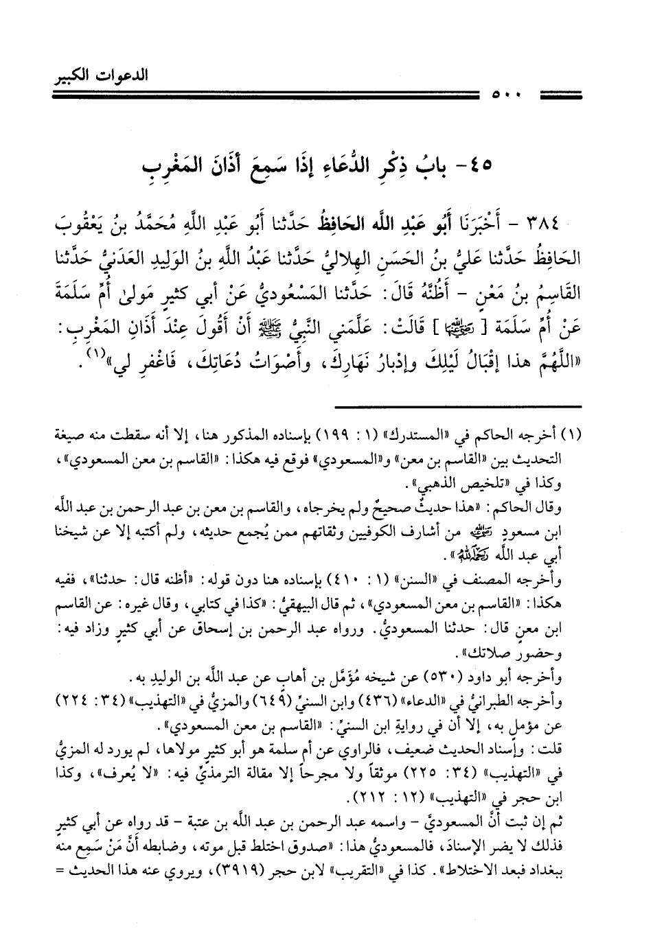 384 - أَخْبَرَنَا أَبُو عَبْدِ اللَّهِ الْحَافِظُ، حَدَّثَنَا أَبُو عَبْدِ اللَّهِ مُحَمَّدُ بْنُ يَعْقُوبَ الْحَافِظُ، حَدَّثَنَا عَلِيُّ بْنُ الْحَسَنِ الْهِلَالِيُّ، حَدَّثَنَا عَبْدُ اللَّهِ بْنُ الْوَلِيدِ الْعَدَنِيُّ، حَدَّثَنَا الْقَاسِمُ بْنُ مَعْنٍ، أَظُنُّهُ قَالَ: حَدَّثَنَا الْمَسْعُودِيُّ، عَنْ أَبِي كَثِيرٍ، مَوْلَى أُمِّ سَلَمَةَ، عَنْ أُمِّ سَلَمَةَ رَضِيَ اللَّهُ عَنْهَا قَالَتْ: عَلَّمَنِي النَّبِيُّ صَلَّى اللهُ عَلَيْهِ وَسَلَّمَ أَنْ أَقُولَ عِنْدَ أَذَانِ الْمَغْرِبِ: «§اللَّهُمَّ هَذَا إِقْبَالُ لَيْلِكَ، وَإِدْبَارُ نَهَارِكَ، وَأَصْوَاتُ دُعَاتِكَ، فَاغْفِرْ لِي»