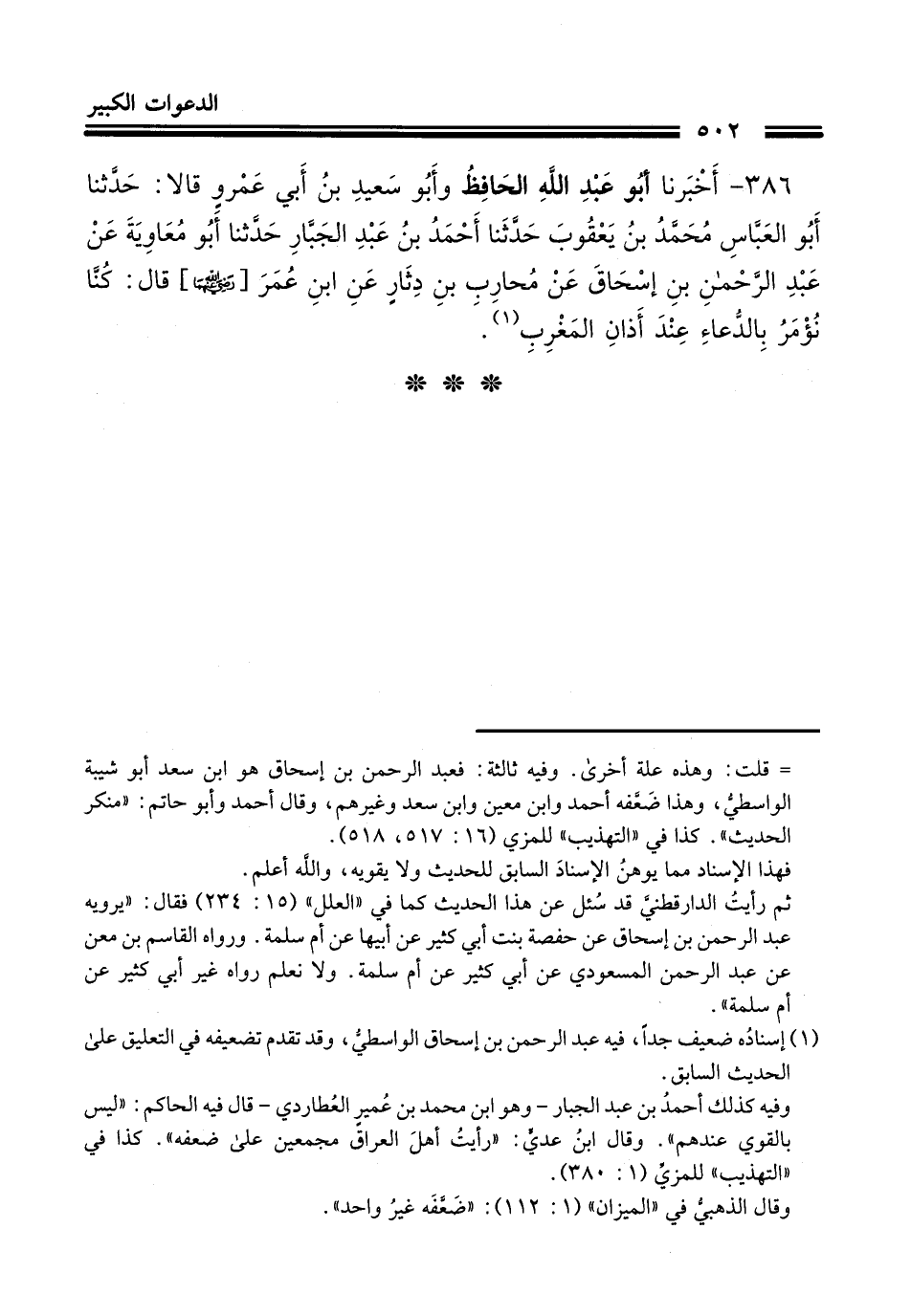 386 - أَخْبَرَنَا أَبُو عَبْدِ اللَّهِ الْحَافِظُ، وَأَبُو سَعِيدِ بْنُ أَبِي عَمْرٍو، قَالَا: حَدَّثَنَا أَبُو الْعَبَّاسِ مُحَمَّدُ بْنُ يَعْقُوبَ، حَدَّثَنَا أَحْمَدُ بْنُ عَبْدِ الْجَبَّارِ، حَدَّثَنَا أَبُو مُعَاوِيَةَ، عَنْ عَبْدِ الرَّحْمَنِ بْنِ إِسْحَاقَ، عَنْ مُحَارِبِ بْنِ دِثَارٍ، عَنِ ابْنِ عُمَرَ رَضِيَ اللَّهُ عَنْهُمَا قَالَ: §كُنَّا نُؤْمَرُ بِالدُّعَاءِ عِنْدَ أَذَانِ الْمَغْرِبِ