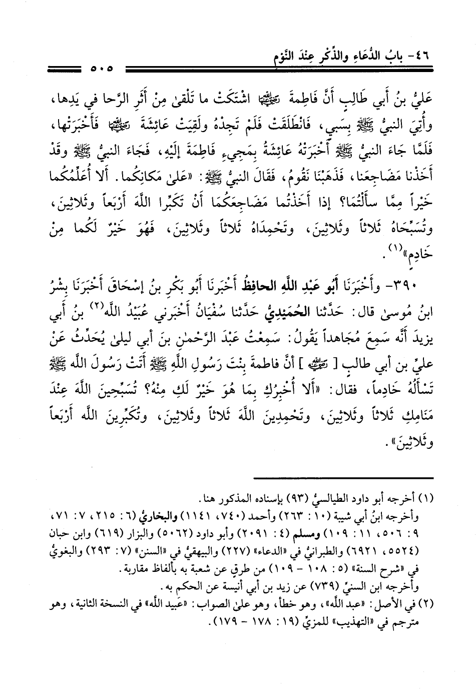 390 - وَأَخْبَرَنَا أَبُو عَبْدِ اللَّهِ الْحَافِظُ، أَخْبَرَنَا أَبُو بَكْرِ بْنُ إِسْحَاقَ، أَخْبَرَنَا بِشْرُ بْنُ مُوسَى، قَالَ: حَدَّثَنَا الْحُمَيْدِيُّ، حَدَّثَنَا سُفْيَانُ، أَخْبَرَنِي عُبَيْدُ اللَّهِ بْنُ أَبِي يَزِيدَ، أَنَّهُ سَمِعَ مُجَاهِدًا، يَقُولُ: سَمِعْتُ عَبْدَ الرَّحْمَنِ بْنَ أَبِي لَيْلَى، يُحَدِّثُ عَنْ عَلِيِّ بْنِ أَبِي طَالِبٍ رَضِيَ اللَّهُ عَنْهُ، أَنَّ فَاطِمَةَ بِنْتَ رَسُولِ اللَّهِ، صَلَّى اللهُ عَلَيْهِ وَسَلَّمَ أَتَتْ رَسُولَ اللَّهِ صَلَّى اللهُ عَلَيْهِ وَسَلَّمَ تَسْأَلُهُ خَادِمًا، فَقَالَ: «أَلَا أُخْبِرُكِ بِمَا هُوَ خَيْرٌ لَكِ مِنْهُ؟ §تُسَبِّحِينَ اللَّهَ عِنْدَ مَنَامِكِ ثَلَاثًا وَثَلَاثِينَ، وَتَحْمَدِينَ اللَّهَ ثَلَاثًا وَثَلَاثِينَ، وَتُكَبِّرِينَ اللَّهَ أَرْبَعًا وَثَلَاثِينَ» ، ثُمَّ قَالَ سُفْيَانُ: إِحْدَاهُنَّ أَرْبَعًا وَثَلَاثِينَ قَالَ عَلِيٌّ: فَمَا تَرَكْتُهَا مُنْذُ سَمِعْتُهَا مِنْ رَسُولِ اللَّهِ صَلَّى اللهُ عَلَيْهِ وَسَلَّمَ فَقَالُوا لَهُ: وَلَا لَيْلَةَ صِفِّينَ؟ قَالَ: وَلَا لَيْلَةَ صِفِّينَ