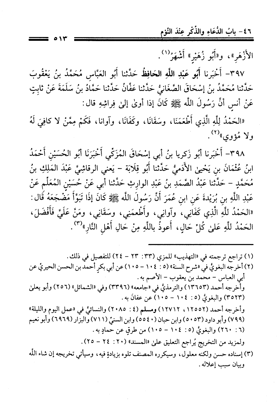 398 - أَخْبَرَنَا أَبُو زَكَرِيَّا بْنُ أَبِي إِسْحَاقَ الْمُزَكِّي، أَخْبَرَنَا أَبُو الْحُسَيْنِ أَحْمَدُ بْنُ عُثْمَانَ بْنِ يَحْيَى الْأَدَمِيُّ، حَدَّثَنَا أَبُو قِلَابَةَ يَعْنِي الرَّقَاشِيَّ عَبْدَ الْمَلِكِ بْنَ مُحَمَّدٍ، حَدَّثَنَا عَبْدُ الصَّمَدِ بْنُ عَبْدِ الْوَارِثِ، حَدَّثَنَا أَبِي، عَنْ حُسَيْنٍ الْمُعَلِّمِ، عَنْ عَبْدِ اللَّهِ بْنِ بُرَيْدَةَ، عَنِ ابْنِ عُمَرَ، أَنَّ رَسُولَ اللَّهِ صَلَّى اللهُ عَلَيْهِ وَسَلَّمَ كَانَ إِذَا تَبَوَّأَ مَضْجَعَهُ قَالَ: «§الْحَمْدُ لِلَّهِ الَّذِي كَفَانِي، وَآوَانِي، وَأَطْعَمَنِي، وَسَقَانِي، وَمَنَّ عَلَيَّ فَأَفْضَلَ، الْحَمْدُ لِلَّهِ عَلَى كُلِّ حَالٍ، أَعُوذُ بِاللَّهِ مِنْ حَالِ أَهْلِ النَّارِ»