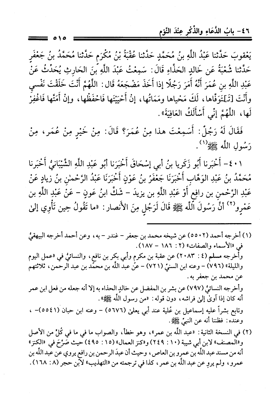 401 - أَخْبَرَنَا أَبُو زَكَرِيَّا بْنُ أَبِي إِسْحَاقَ، أَخْبَرَنَا أَبُو عَبْدِ اللَّهِ الشَّيْبَانِيُّ، أَخْبَرَنَا مُحَمَّدُ بْنُ عَبْدِ الْوَهَّابِ، أَخْبَرَنَا جَعْفَرُ بْنُ عَوْنٍ، أَخْبَرَنَا عَبْدُ الرَّحْمَنِ بْنُ زِيَادٍ، عَنْ عَبْدِ الرَّحْمَنِ بْنِ رَافِعٍ، أَوْ عَبْدِ اللَّهِ بْنِ يَزِيدَ، شَكَّ ابْنُ عَوْنٍ، عَنْ عَبْدِ اللَّهِ بْنِ عَمْرٍو، أَنَّ رَسُولَ اللَّهِ صَلَّى اللهُ عَلَيْهِ وَسَلَّمَ قَالَ لِرَجُلٍ مِنَ الْأَنْصَارِ: §«مَا تَقُولُ حِينَ تَأْوِي إِلَى فِرَاشِكَ؟» قَالَ أَقُولُ: اللَّهُمَّ بِاسْمِكَ وَضَعَتُ جَنْبِي، فَاغْفِرْ لِي ذَنْبِي قَالَ: «قَدْ غَفَرَ اللَّهُ لَكَ»