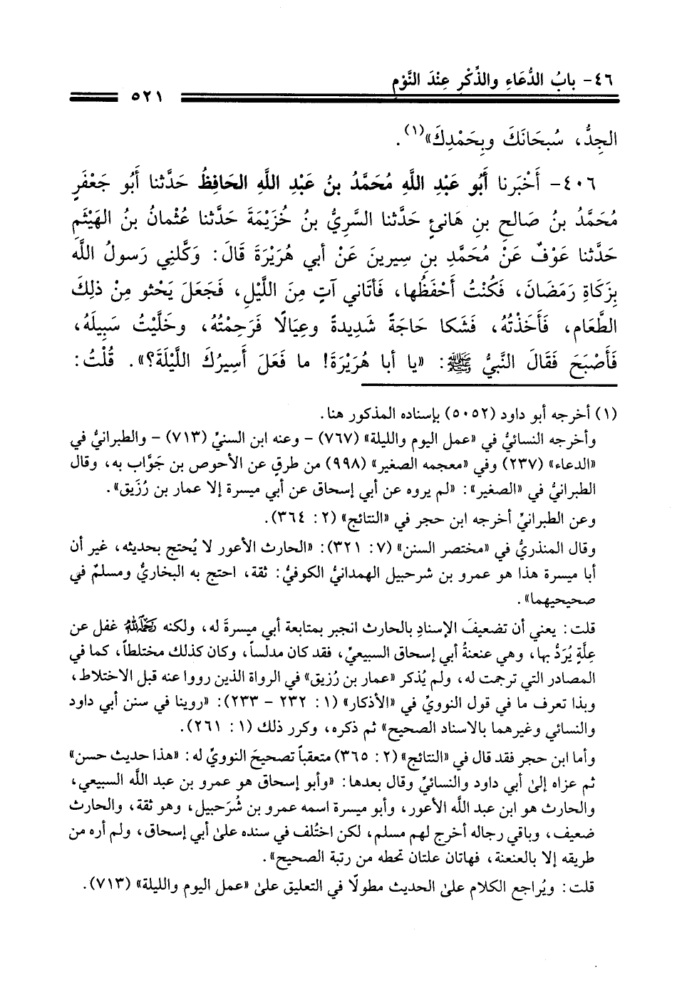 406 - أَخْبَرَنَا أَبُو عَبْدِ اللَّهِ مُحَمَّدُ بْنُ عَبْدِ اللَّهِ الْحَافِظُ، حَدَّثَنَا أَبُو جَعْفَرٍ مُحَمَّدُ بْنُ صَالِحِ بْنِ هَانِئٍ، حَدَّثَنَا السَّرِيُّ بْنُ خُزَيْمَةَ، حَدَّثَنَا عُثْمَانُ بْنُ الْهَيْثَمِ، حَدَّثَنَا عَوْفٌ، عَنْ مُحَمَّدِ بْنِ سِيرِينَ، عَنْ أَبِي هُرَيْرَةَ، قَالَ: وَكَّلَنِي رَسُولُ اللَّهِ صَلَّى اللهُ عَلَيْهِ وَسَلَّمَ بِزَكَاةِ رَمَضَانَ، فَكُنْتُ أَحْفَظُهَا فَآتَانِي آتٍ مِنَ اللَّيْلِ، فَجَعَلَ يَحْثُو مِنْ ذَلِكَ الطَّعَامِ، فَأَخَذْتُهُ فَشَكَا حَاجَةً شَدِيدَةً وَعِيَالًا فَرَحِمْتُهُ، وَخَلَّيْتُ سَبِيلَهُ، فَأَصْبَحَ فَقَالَ النَّبِيُّ صَلَّى اللهُ عَلَيْهِ وَسَلَّمَ: «يَا أَبَا هُرَيْرَةَ مَا فَعَلَ أَسِيرُكَ اللَّيْلَةَ؟» قُلْتُ: يَا نَبِيَّ اللَّهِ، شَكَا حَاجَةً شَدِيدَةً فَرَحِمْتُهُ، وَخَلَّيْتُ سَبِيلَهُ، قَالَ: «أَمَا إِنَّهُ قَدْ كَذَبَكَ وَسَيَعُودُ» -[522]- قَالَ: فَرَصَدَهُ أَبُو هُرَيْرَةَ، فَإِذَا هُوَ قَدْ جَاءَ يَحْثُو مِنَ الطَّعَامِ، فَأَخَذَهُ فَقَالَ: لَأَرْفَعَنَّكَ إِلَى رَسُولِ اللَّهِ صَلَّى اللهُ عَلَيْهِ وَسَلَّمَ قَالَ: فَشَكَا إِلَيْهِ حَاجَةً وَعِيَالًا فَرَحِمَهُ وَخَلَّى سَبِيلِهِ، فَأَصْبَحَ فَقَالَ لَهُ النَّبِيُّ صَلَّى اللهُ عَلَيْهِ وَسَلَّمَ: «مَا فَعَلَ أَسِيرُكَ؟» قَالَ: يَا نَبِيَّ اللَّهِ، ذَكَرَ حَاجَةً وَعِيَالًا كَثِيرًا فَرَحِمْتُهُ وَخَلَّيْتُ سَبِيلَهُ، قَالَ: «أَمَا إِنَّهُ قَدْ كَذَبَكَ وَسَيَعُودُ» قَالَ: فَرَصَدَهُ أَبُو هُرَيْرَةَ، فَإِذَا هُوَ قَدْ جَاءَ يَحْثُو مِنَ الطَّعَامِ قَالَ: لَأَرْفَعَنَّكَ إِلَى رَسُولِ اللَّهِ صَلَّى اللهُ عَلَيْهِ وَسَلَّمَ قَالَ: دَعْنِي فَإِنِّي لَا أَعُودُ، وَأُعَلِّمُكَ كَلِمَاتٍ يَنْفَعُكَ اللَّهُ بِهَا قَالَ: وَمَا هِيَ؟ قَالَ: إِذَا أَوَيْتَ إِلَى فِرَاشِكَ فَاقْرَأْ هَذِهِ الْآيَةَ: {اللَّهُ لَا إِلَهَ إِلَّا هُوَ الْحَيُّ الْقَيُّومُ} [البقرة: 255] حَتَّى تَخْتِمَ الْآيَةَ، فَإِنَّهُ لَنْ يَزَالَ عَلَيْكَ مِنَ اللَّهِ حَافِظٌ، وَلَا يَقْرَبُكَ شَيْطَانٌ حَتَّى تُصْبِحَ، قَالَ: فَأَصْبَحَ، فَقَالَ النَّبِيُّ صَلَّى اللهُ عَلَيْهِ وَسَلَّمَ: «مَا فَعَلَ أَسِيرُكَ اللَّيْلَةَ؟» قَالَ: يَا نَبِيَّ اللَّهِ، عَلَّمَنِي شَيْئًا زَعَمَ أَنَّ اللَّهَ تَعَالَى يَنْفَعُنِي بِهِ فَخَلَّيْتُ سَبِيلَهُ، قَالَ: «وَمَا هُوَ؟» قَالَ: أَمَرَنِي أَنْ أَقْرَأَ آيَةَ الْكُرْسِيِّ إِذَا أَوَيْتُ إِلَى فِرَاشِي، وَزَعَمَ أَنَّهُ لَا يَقْرَبُنِي شَيْطَانٌ حَتَّى أُصْبِحَ، وَلَا يَزَالُ عَلَيَّ مِنَ اللَّهِ حَافِظٌ قَالَ: «إِنَّهُ قَدْ §صَدَّقَكَ وَهُوَ كَذُوبٌ، أَتَدْرِي مَنْ تُخَاطِبُ مُنْذُ ثَلَاثِ لَيَالٍ يَا أَبَا هُرَيْرَةَ؟» قَالَ: لَا، قَالَ: «ذَلِكَ شَيْطَانٌ»