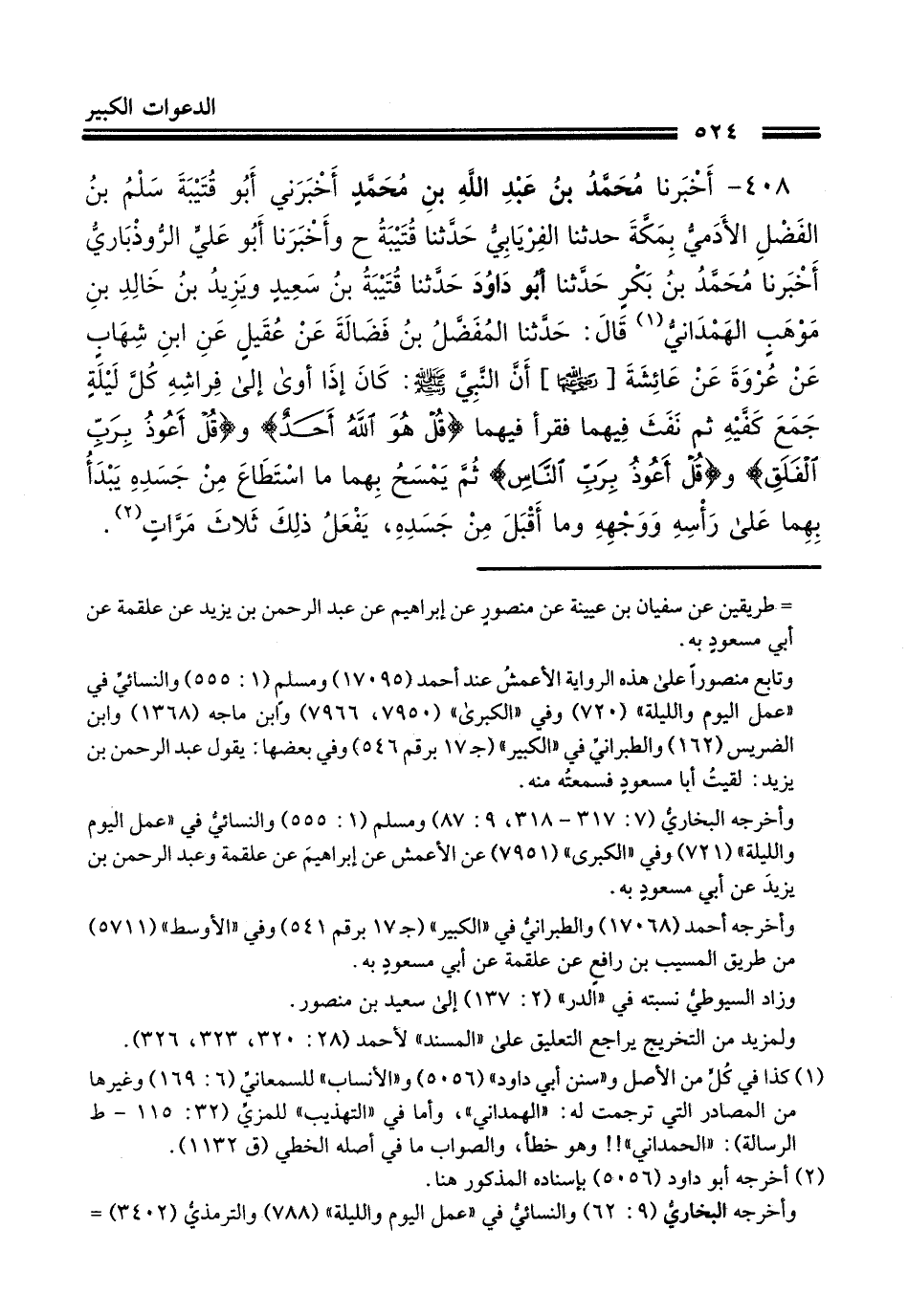 408 - أَخْبَرَنَا مُحَمَّدُ بْنُ عَبْدِ اللَّهِ بْنِ مُحَمَّدٍ، أَخْبَرَنِي أَبُو قُتَيْبَةَ سَلْمُ بْنُ الْفَضْلِ الْآدَمِيُّ، بِمَكَّةَ، حَدَّثَنَا الْفِرْيَابِيُّ، حَدَّثَنَا قُتَيْبَةُ، ح وَأَخْبَرَنَا أَبُو عَلِيٍّ الرُّوذْبَارِيُّ، أَخْبَرَنَا مُحَمَّدُ بْنُ بَكْرٍ، حَدَّثَنَا أَبُو دَاوُدَ، حَدَّثَنَا قُتَيْبَةُ بْنُ سَعِيدٍ، وَيَزِيدُ بْنُ خَالِدِ بْنِ مَوْهَبٍ الْهَمْدَانِيُّ، قَالَا: حَدَّثَنَا الْمُفَضَّلُ بْنُ فَضَالَةَ، عَنْ عُقَيْلٍ، عَنِ ابْنِ شِهَابٍ،، عَنْ عُرْوَةَ، عَنْ عَائِشَةَ رَضِيَ اللَّهُ عَنْهَا، أَنَّ النَّبِيَّ صَلَّى اللهُ عَلَيْهِ وَسَلَّمَ كَانَ §إِذَا أَوَى إِلَى فِرَاشِهِ كُلَّ لَيْلَةٍ جَمَعَ كَفَّيْهِ، وَنَفَثَ فِيهِمَا قُلْ هُوَ اللَّهُ أَحَدٌ، وَقُلْ أَعُوذُ بِرَبِّ الْفَلَقِ، وَقُلْ أَعُوذُ بِرَبِّ النَّاسِ، ثُمَّ يَمْسَحُ بِهِمَا مَا اسْتَطَاعَ مِنْ جَسَدِهِ يَبْدَأُ بِهِمَا عَلَى رَأْسِهِ وَوَجْهِهِ، وَمَا أَقْبَلَ مِنْ جَسَدِهِ، يَفْعَلُ ذَلِكَ ثَلَاثَ مَرَّاتٍ