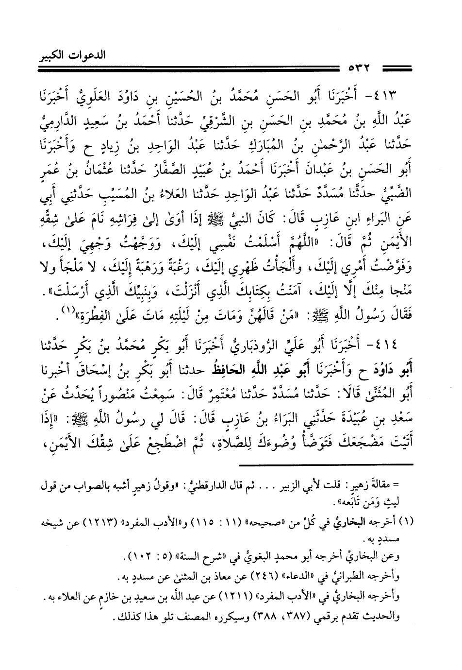 413 - أَخْبَرَنَا أَبُو الْحَسَنِ مُحَمَّدُ بْنُ الْحُسَيْنِ بْنِ دَاوُدَ الْعَلَوِيُّ، أَخْبَرَنَا عَبْدُ اللَّهِ بْنُ مُحَمَّدِ بْنِ الْحَسَنِ بْنِ الشَّرْقِيِّ، حَدَّثَنَا أَحْمَدُ بْنُ سَعِيدٍ الدَّارِمِيُّ، حَدَّثَنَا عَبْدُ الرَّحْمَنِ بْنُ الْمُبَارَكِ، حَدَّثَنَا عَبْدُ الْوَاحِدِ بْنُ زِيَادٍ، ح وأَخْبَرَنَا أَبُو الْحَسَنِ بْنُ عَبْدَانَ، أَخْبَرَنَا أَحْمَدُ بْنُ عُبَيْدٍ الصَّفَّارُ، حَدَّثَنَا عُثْمَانُ بْنُ عُمَرَ الضَّبِّيُّ، حَدَّثَنَا مُسَدَّدٌ، حَدَّثَنَا عَبْدُ الْوَاحِدِ، حَدَّثَنَا الْعَلَاءُ بْنُ الْمُسَيَّبِ، حَدَّثَنِي أَبِي، عَنِ الْبَرَاءِ بْنِ عَازِبٍ، قَالَ: كَانَ رَسُولُ اللَّهِ صَلَّى اللهُ عَلَيْهِ وَسَلَّمَ إِذَا أَوَى إِلَى فِرَاشِهِ نَامَ عَلَى شِقِّهِ الْأَيْمَنِ، ثُمَّ قَالَ: «§اللَّهُمَّ أَسْلَمْتُ نَفْسِي إِلَيْكَ، وَوَجَّهْتُ وَجْهِي إِلَيْكَ، وَفَوَّضْتُ أَمْرِي إِلَيْكَ، وَأَلْجَأْتُ ظَهْرِي إِلَيْكَ، رَغْبَةً وَرَهْبَةً إِلَيْكَ، لَا مَلْجَأَ وَلَا مَنْجَا مِنْكَ إِلَّا إِلَيْكَ، آمَنْتُ بِكِتَابِكَ الَّذِي أَنْزَلْتَ، وَبِنَبِيِّكَ الَّذِي أَرْسَلْتَ» فَقَالَ رَسُولُ اللَّهِ صَلَّى اللهُ عَلَيْهِ وَسَلَّمَ: «مَنْ قَالَهُنَّ وَمَاتَ مِنْ لَيْلَتِهِ مَاتَ عَلَى الْفِطْرَةِ»