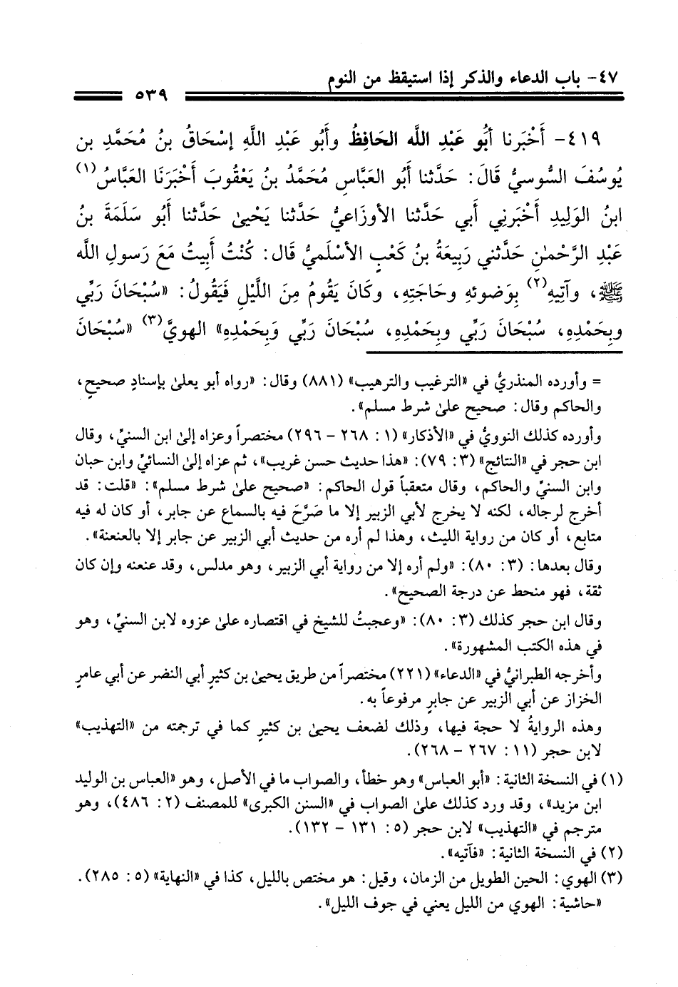 419 - أَخْبَرَنَا أَبُو عَبْدِ اللَّهِ الْحَافِظُ، وَأَبُو عَبْدِ اللَّهِ إِسْحَاقُ بْنُ مُحَمَّدِ بْنِ يُوسُفَ السُّوسِيُّ، قَالَا: حَدَّثَنَا أَبُو الْعَبَّاسِ مُحَمَّدُ بْنُ يَعْقُوبَ، أَخْبَرَنَا الْعَبَّاسُ بْنُ الْوَلِيدِ، أَخْبَرَنِي أَبِي، حَدَّثَنَا الْأَوْزَاعِيُّ، حَدَّثَنَا يَحْيَى، حَدَّثَنَا أَبُو سَلَمَةَ بْنُ عَبْدِ الرَّحْمَنِ، حَدَّثَنِي رَبِيعَةُ بْنُ كَعْبٍ الْأَسْلَمِيُّ، قَالَ: كُنْتُ أَبِيتُ مَعَ رَسُولِ اللَّهِ صَلَّى اللهُ عَلَيْهِ وَسَلَّمَ فَآتِيهِ بِوَضُوئِهِ وَحَاجَتِهِ، وَكَانَ يَقُومُ مِنَ اللَّيْلِ فَيَقُولُ: «سُبْحَانَ رَبِّي وَبِحَمْدِهِ، سُبْحَانَ رَبِّي وَبِحَمْدِهِ» الْهَوِيَّ «سُبْحَانَ رَبِّ الْعَالَمِينَ، سُبْحَانَ رَبِّ الْعَالَمِينَ، سُبْحَانَ رَبِّ الْعَالَمِينَ» الْهَوِيَّ قَالَ فَقَالَ لِي رَسُولُ اللَّهِ صَلَّى اللهُ عَلَيْهِ وَسَلَّمَ: «هَلْ لَكَ حَاجَةٌ؟» قَالَ: قُلْتُ: يَا رَسُولَ اللَّهِ، مُرَافَقَتَكَ فِي الْجَنَّةِ قَالَ: «أَوْ غَيْرَ ذَلِكَ؟» قَالَ: قُلْتُ: يَا رَسُولَ اللَّهِ، مُرَافَقَتَكَ فِي الْجَنَّةِ، قَالَ: §«فَأَعِنِّي عَلَى نَفْسِكَ بِكَثْرَةِ السُّجُودِ»