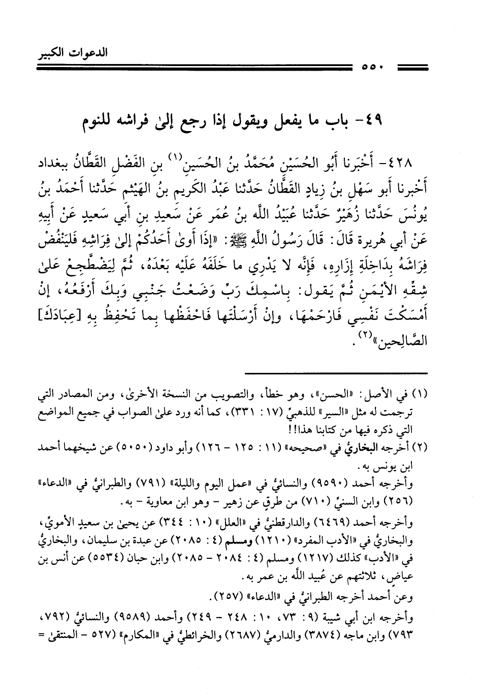 428 - أَخْبَرَنَا أَبُو الْحُسَيْنِ مُحَمَّدُ بْنُ الْحُسَيْنِ بْنِ الْفَضْلِ الْقَطَّانُ بِبَغْدَادَ، أَخْبَرَنَا أَبُو سَهْلِ بْنُ زِيَادٍ الْقَطَّانُ، حَدَّثَنَا عَبْدُ الْكَرِيمِ بْنُ الْهَيْثَمِ، حَدَّثَنَا أَحْمَدُ بْنُ يُونُسَ، حَدَّثَنَا زُهَيْرٌ، حَدَّثَنَا عُبَيْدُ اللَّهِ بْنُ عُمَرَ، عَنْ سَعِيدِ بْنِ أَبِي سَعِيدٍ، عَنْ أَبِيهِ، عَنْ أَبِي هُرَيْرَةَ، قَالَ: قَالَ رَسُولُ اللَّهِ صَلَّى اللهُ عَلَيْهِ وَسَلَّمَ: §" إِذَا أَوَى أَحَدُكُمْ إِلَى فِرَاشِهِ فَلْيَنْفُضْ فِرَاشَهُ بِدَاخِلَةِ إِزَارِهِ، فَإِنَّهُ لَا يَدْرِي مَا خَلَّفَهُ عَلَيْهِ بَعْدَهُ، ثُمَّ لِيَضْطَجِعْ عَلَى شِقِّهِ الْأَيْمَنِ ثُمَّ يَقُولُ: بِاسْمِكَ رَبِّي وَضَعْتُ جَنْبِي وَبِكَ أَرْفَعُهُ، إِنْ أَمْسَكْتَ نَفْسِي فَارْحَمْهَا، وَإِنْ أَرْسَلْتَهَا فَاحْفَظْهَا بِمَا تَحْفَظُ بِهِ عِبَادَكَ الصَّالِحِينَ "