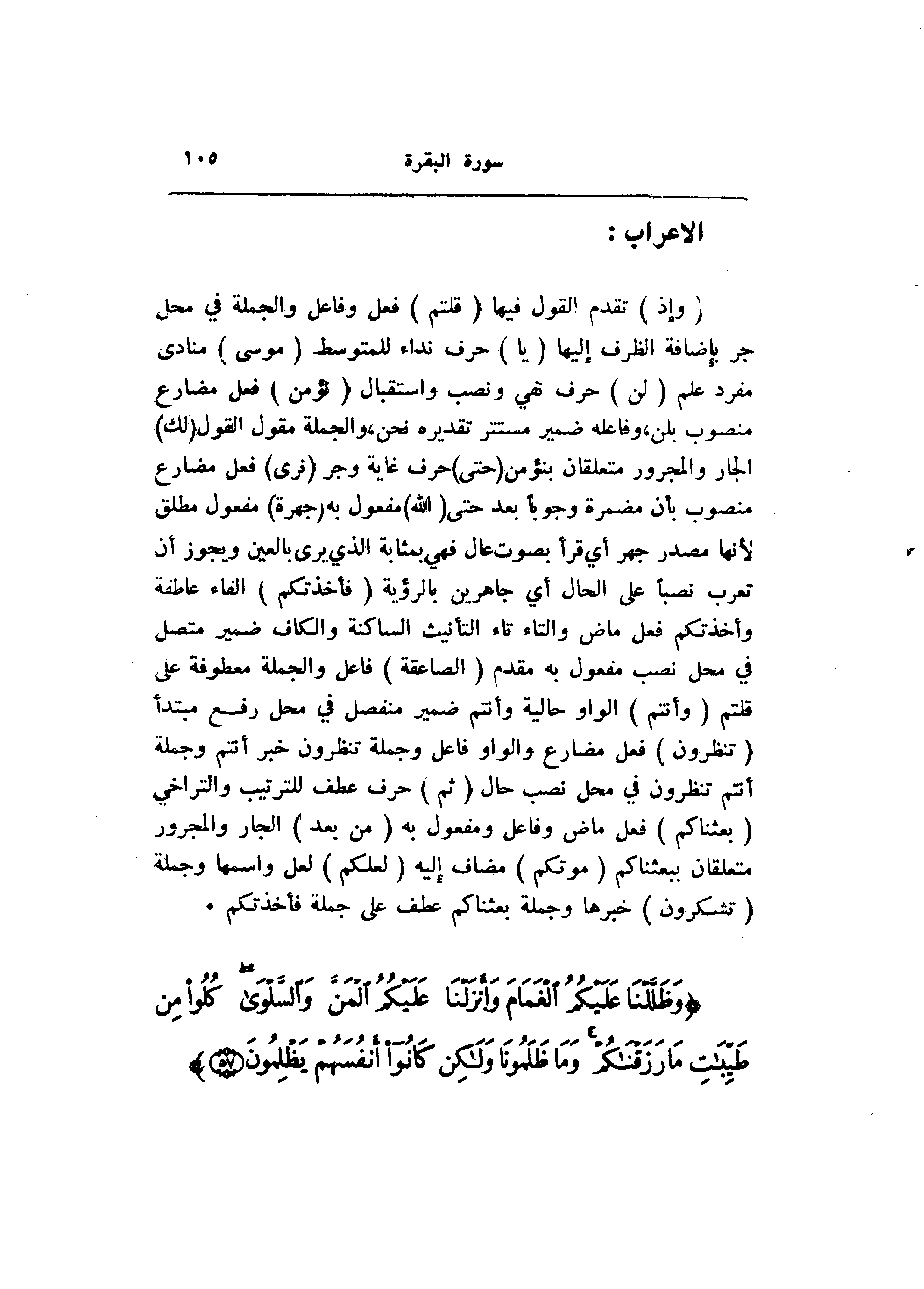 (وَإِذْ) تقدم القول فيها (قُلْتُمْ) فعل وفاعل والجملة في محل جر بإضافة الظرف إليها (يا) حرف نداء للمتوسط (مُوسى) منادى مفرد علم (لَنْ) حرف نفي ونصب واستقبال (نُؤْمِنَ) فعل مضارع منصوب بلن، وفاعله ضمير مستتر تقديره نحن، والجملة مقول القول (لَكَ) الجار والمجرور متعلقان بنؤمن (حَتَّى) حرف غاية وجر (نَرَى) فعل مضارع منصوب بأن مضمرة وجوبا بعد حتى (اللَّهَ) مفعول به (جَهْرَةً) مفعول مطلق لأنها مصدر جهر أي قرأ بصوت عال فهي بمثابة الذي يرى بالعين ويجوز أن تعرب نصبا على الحال أي جاهرين بالرؤية (فَأَخَذَتْكُمُ) الفاء عاطفة وأخذتكم فعل ماض والتاء تاء التأنيث الساكنة والكاف ضمير متصل في محل نصب مفعول به مقدم (الصَّاعِقَةُ) فاعل والجملة معطوفة على قلتم (وَأَنْتُمْ) الواو حالية وأنتم ضمير منفصل في محل رفع مبتدأ (تَنْظُرُونَ) فعل مضارع والواو فاعل وجملة تنظرون خبر أنتم وجملة أنتم تنظرون في محل نصب حال (ثُمَّ) حرف عطف للترتيب والتراخي (بَعَثْناكُمْ) فعل ماض وفاعل ومفعول به (مِنْ بَعْدِ) الجار والمجرور متعلقان ببعثناكم (مَوْتِكُمْ) مضاف إليه (لَعَلَّكُمْ) لعل واسمها وجملة (تَشْكُرُونَ) خبرها وجملة بعثناكم عطف على جملة فأخذتكم.
