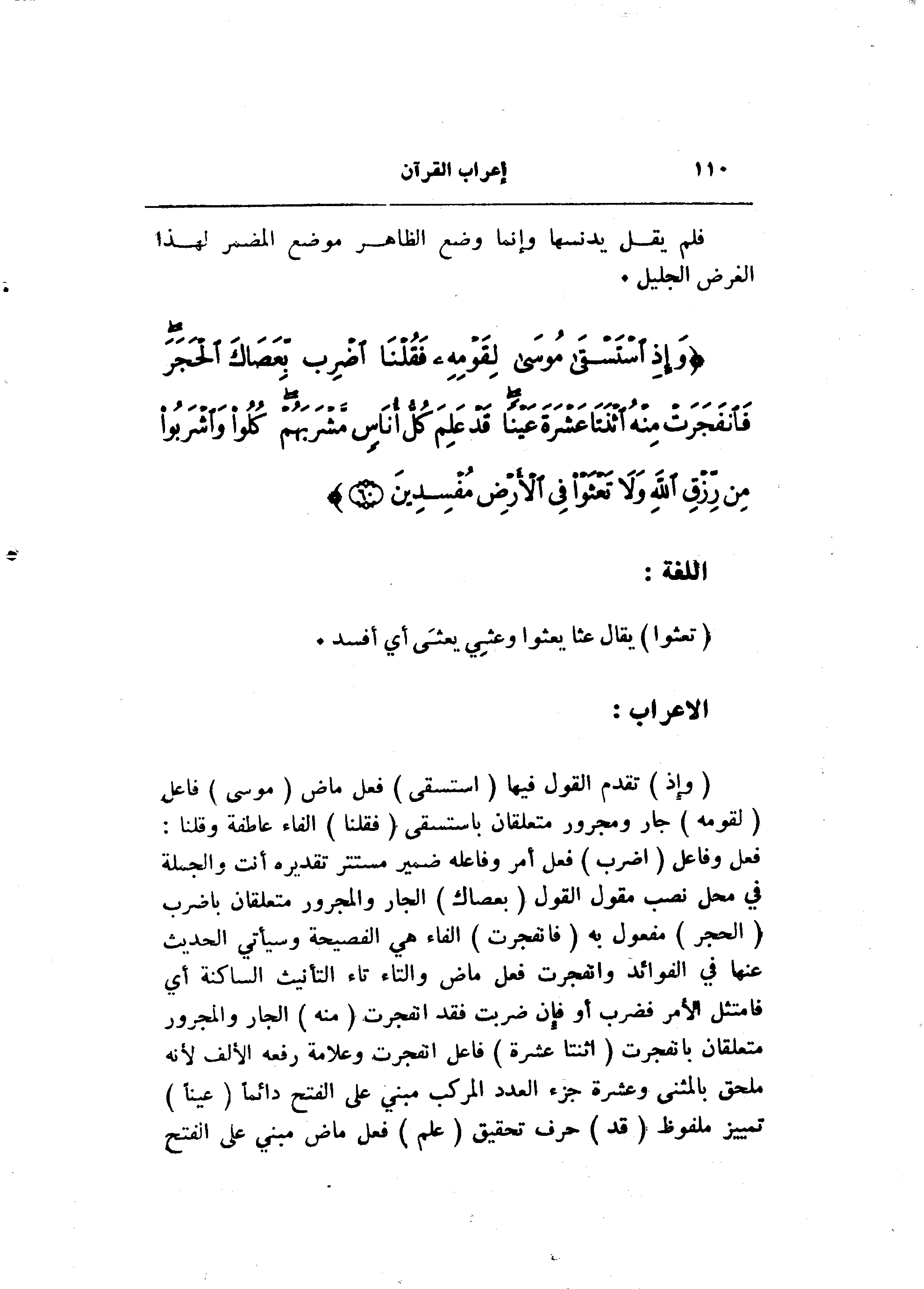 فعل وفاعل (اضْرِبْ) فعل أمر وفاعله ضمير مستتر تقديره أنت والجملة في محل نصب مقول القول (بِعَصاكَ) الجار والمجرور متعلقان باضرب (الْحَجَرَ) مفعول به (فَانْفَجَرَتْ) الفاء هي الفصيحة وسيأتي الحديث عنها في الفوائد وانفجرت فعل ماض والتاء تاء التأنيث الساكنة أي فامتثل الأمر فضرب أو فإن ضربت فقد انفجرت (مِنْهُ) الجار والمجرور متعلقان بانفجرت (اثْنَتا عَشْرَةَ) فاعل انفجرت وعلامة رفعه الألف لأنه ملحق بالمثنى وعشرة جزء العدد المركب مبني على الفتح دائما (عَيْناً) تمييز ملفوظ (قَدْ) حرف تحقيق (عَلِمَ) فعل ماض مبني على الفتح