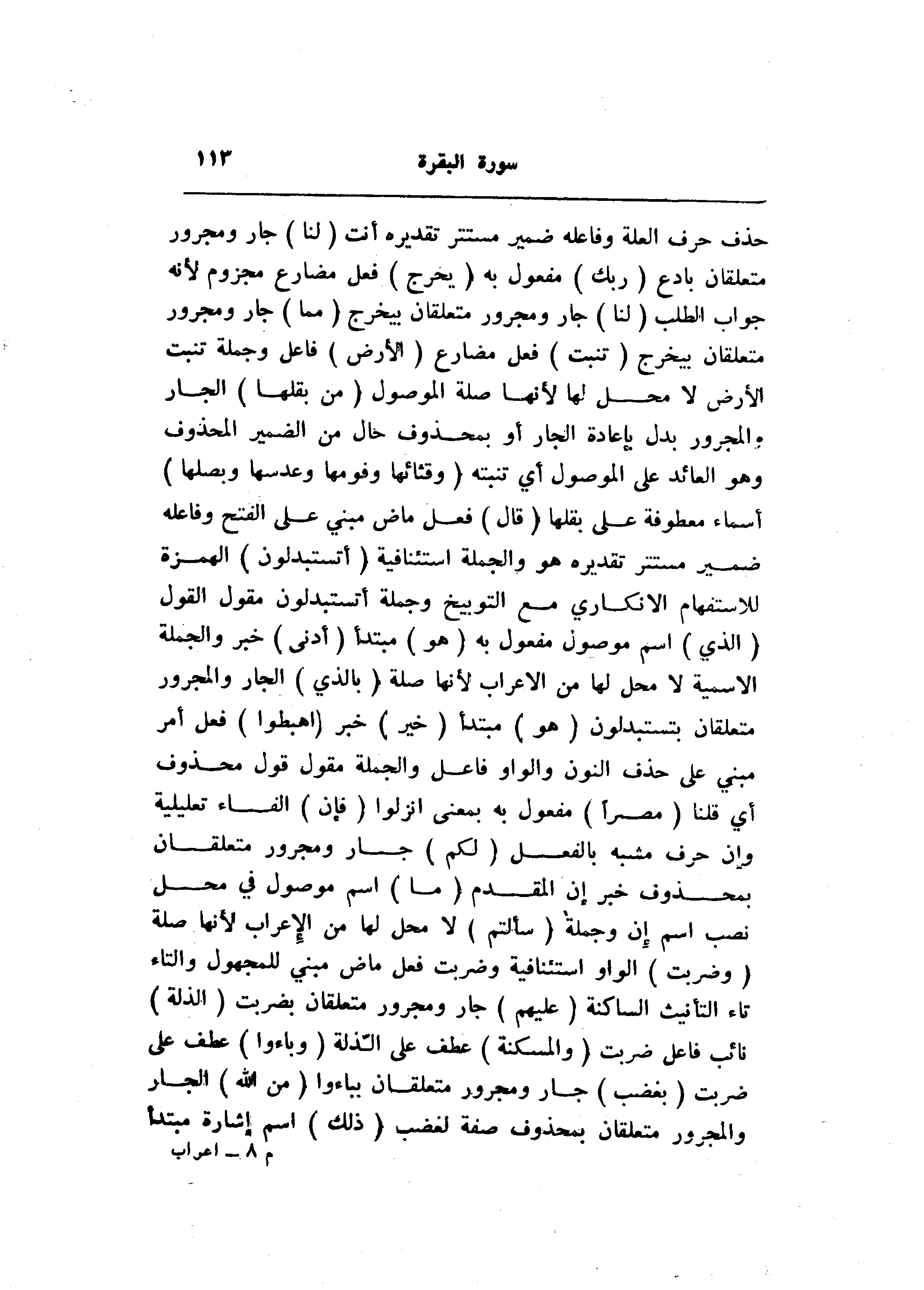 حذف حرف العلة وفاعله ضمير مستتر تقديره أنت (لَنا) جار ومجرور متعلقان بادع (رَبَّكَ) مفعول به (يُخْرِجْ) فعل مضارع مجزوم لأنه جواب الطلب (لَنا) جار ومجرور متعلقان بيخرج (مِمَّا) جار ومجرور متعلقان بيخرج (تُنْبِتُ) فعل مضارع (الْأَرْضُ) فاعل وجملة تنبت الأرض لا محل لها لأنها صلة الموصول (مِنْ بَقْلِها) الجار والمجرور بدل بإعادة الجار أو بمحذوف حال من الضمير المحذوف وهو العائد على الموصول أي تنبته (وَقِثَّائِها وَفُومِها وَعَدَسِها وَبَصَلِها) أسماء معطوفة على بقلها (قالَ) فعل ماض مبني على الفتح وفاعله ضمير مستتر تقديره هو والجملة استئنافية (أَتَسْتَبْدِلُونَ) الهمزة للاستفهام الانكاري مع التوبيخ وجملة أتستبدلون مقول القول (الَّذِي) اسم موصول مفعول به (هُوَ) مبتدأ (أَدْنى) خبر والجملة الاسمية لا محل لها من الإعراب لأنها صلة (بِالَّذِي) الجار والمجرور متعلقان بتستبدلون (هُوَ) مبتدأ (خَيْرٌ) خبر (اهْبِطُوا) فعل أمر مبني على حذف النون والواو فاعل والجملة مقول قول محذوف أي قلنا (مِصْراً) مفعول به بمعنى انزلوا (فَإِنَّ) الفاء تعليلية وإن حرف مشبه بالفعل (لَكُمْ) جار ومجرور متعلقان بمحذوف خبر إن المقدم (ما) اسم موصول في محل نصب اسم إن وجملة (سَأَلْتُمْ) لا محل لها من الإعراب لأنها صلة (وَضُرِبَتْ) الواو استئنافية وضربت فعل ماض مبني للمجهول والتاء تاء التأنيث الساكنة (عَلَيْهِمُ) جار ومجرور متعلقان بضربت (الذِّلَّةُ) نائب فاعل ضربت (وَالْمَسْكَنَةُ) عطف على الذّلة (وَباؤُ) عطف على ضربت (بِغَضَبٍ) جار ومجرور متعلقان بباءوا (مِنَ اللَّهِ) الجار والمجرور متعلقان بمحذوف صفة لغضب (ذلِكَ) اسم إشارة مبتدأ