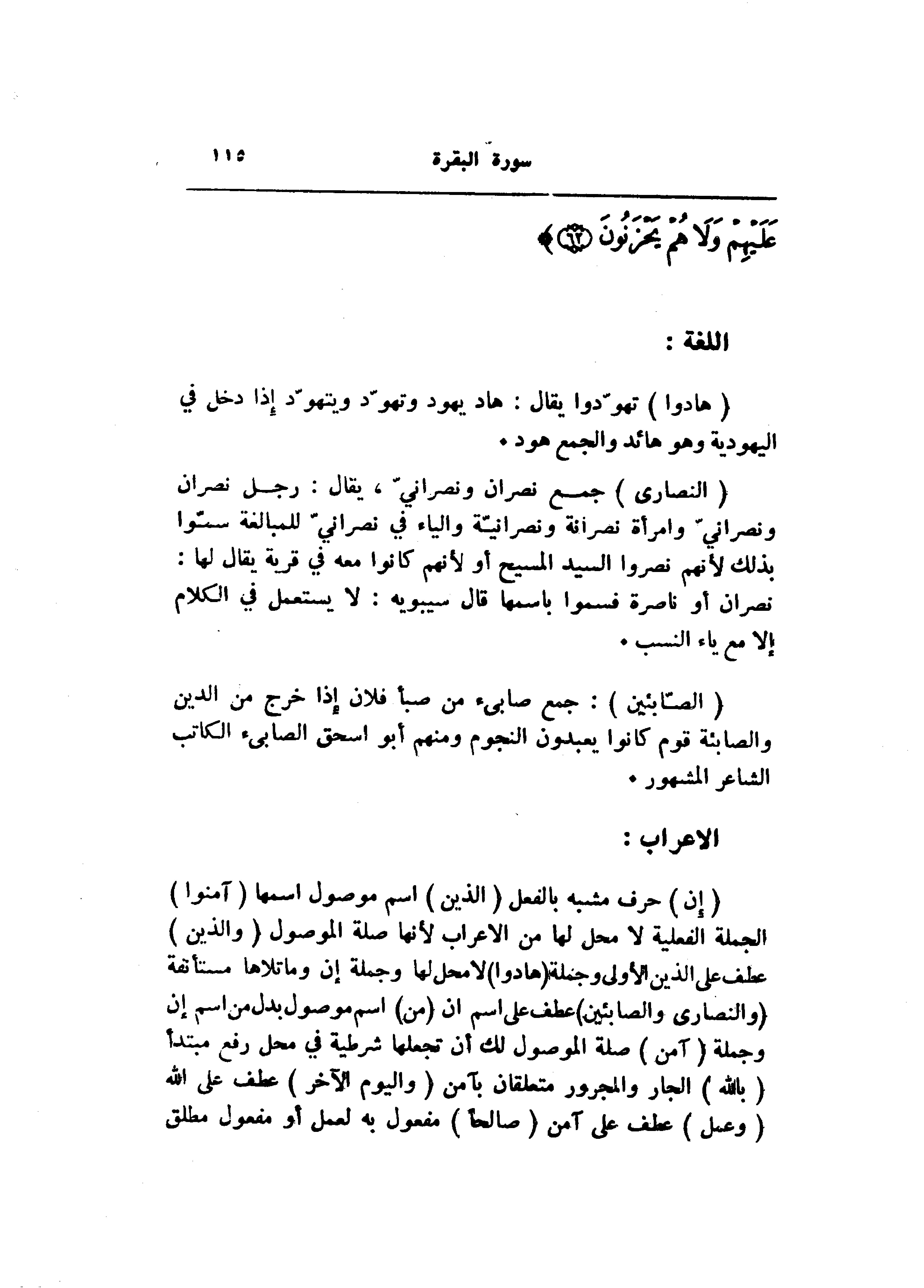 (إِنَّ) حرف مشبه بالفعل (الَّذِينَ) اسم موصول اسمها (آمَنُوا) الجملة الفعلية لا محل لها من الإعراب لأنها صلة الموصول (وَالَّذِينَ) عطف على الذين الأولى وجملة (هادُوا) لا محل لها وجملة إن وما تلاها مستأنفة (وَالنَّصارى وَالصَّابِئِينَ) عطف على اسم ان (مَنْ) اسم موصول بدل من اسم إن وجملة (آمَنَ) صلة الموصول لك أن تجعلها شرطية في محل رفع مبتدأ (بِاللَّهِ) الجار والمجرور متعلقان بآمن (وَالْيَوْمِ الْآخِرِ) عطف على الله (وَعَمِلَ) عطف على آمن (صالِحاً) مفعول به لعمل أو مفعول مطلق