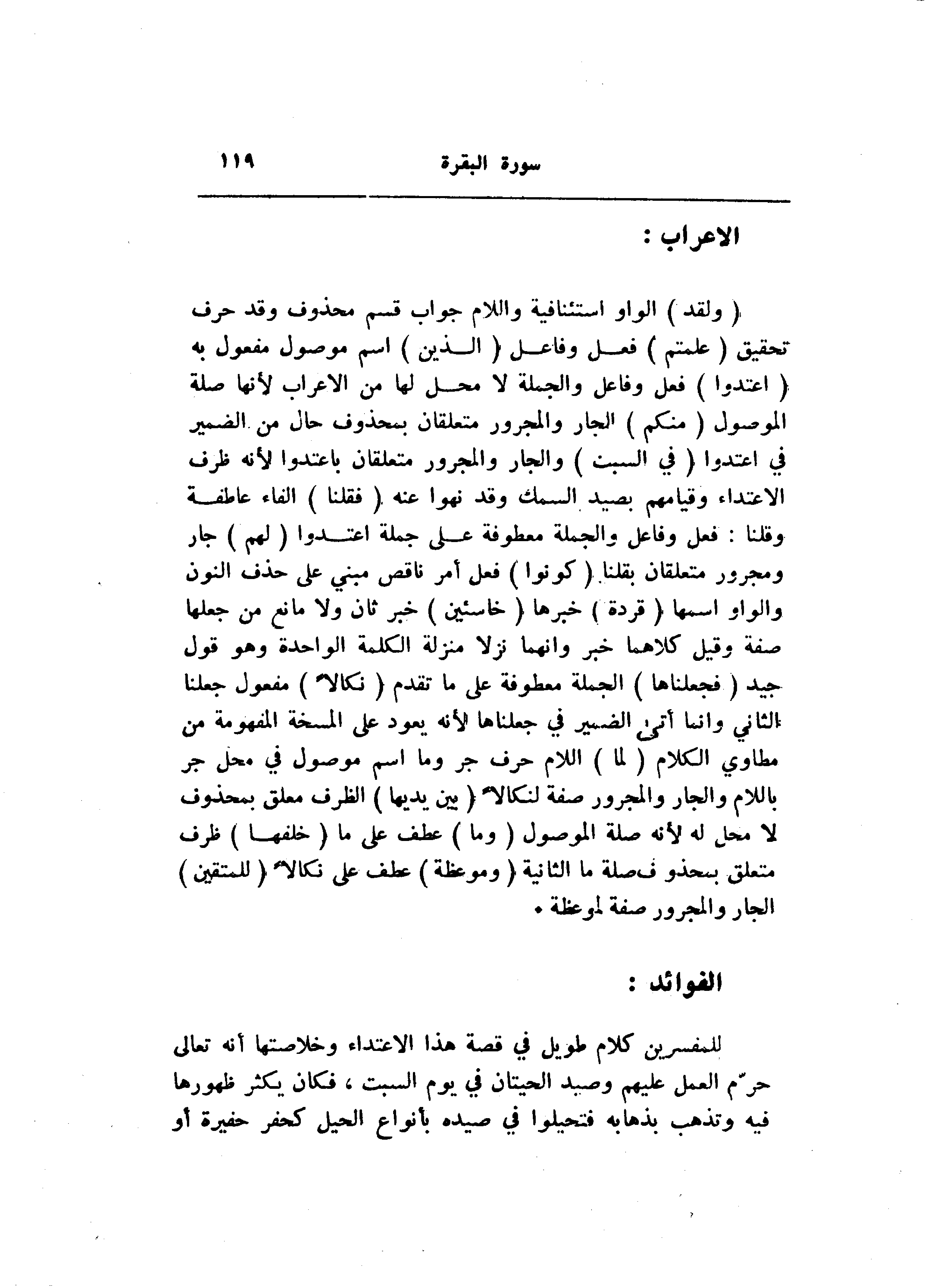 (وَلَقَدْ) الواو استئنافية واللام جواب قسم محذوف وقد حرف تحقيق (عَلِمْتُمُ) فعل وفاعل (الَّذِينَ) اسم موصول مفعول به (اعْتَدَوْا) فعل وفاعل والجملة لا محل لها من الإعراب لأنها صلة الموصول (مِنْكُمْ) الجار والمجرور متعلقان بمحذوف حال من الضمير في اعتدوا (فِي السَّبْتِ) والجار والمجرور متعلقان باعتدوا لأنه ظرف الاعتداء وقيامهم بصيد السمك وقد نهوا عنه (فَقُلْنا) الفاء عاطفة وقلنا: فعل وفاعل والجملة معطوفة على جملة اعتدوا (لَهُمْ) جار ومجرور متعلقان بقلنا (كُونُوا) فعل أمر ناقص مبني على حذف النون والواو اسمها (قِرَدَةً) خبرها (خاسِئِينَ) خبر ثان ولا مانع من جعلها صفة وقيل كلاهما خبر وانهما نزلا منزلة الكلمة الواحدة وهو قول جيد (فَجَعَلْناها) الجملة معطوفة على ما تقدم (نَكالًا) مفعول جعلنا الثاني وانما أتى الضمير في جعلناها لأنه يعود على المسخة المفهومة من مطاوي الكلام (لِما) اللام حرف جر وما اسم موصول في محل جر باللام والجار والمجرور صفة لنكالا (بَيْنَ يَدَيْها) الظرف معلق بمحذوف لا محل له لأنه صلة الموصول (وَما) عطف على ما (خَلْفَها) ظرف متعلق بمحذوف صلة ما الثانية (وَمَوْعِظَةً) عطف على نكالا (لِلْمُتَّقِينَ) الجار والمجرور صفة لموعظة.