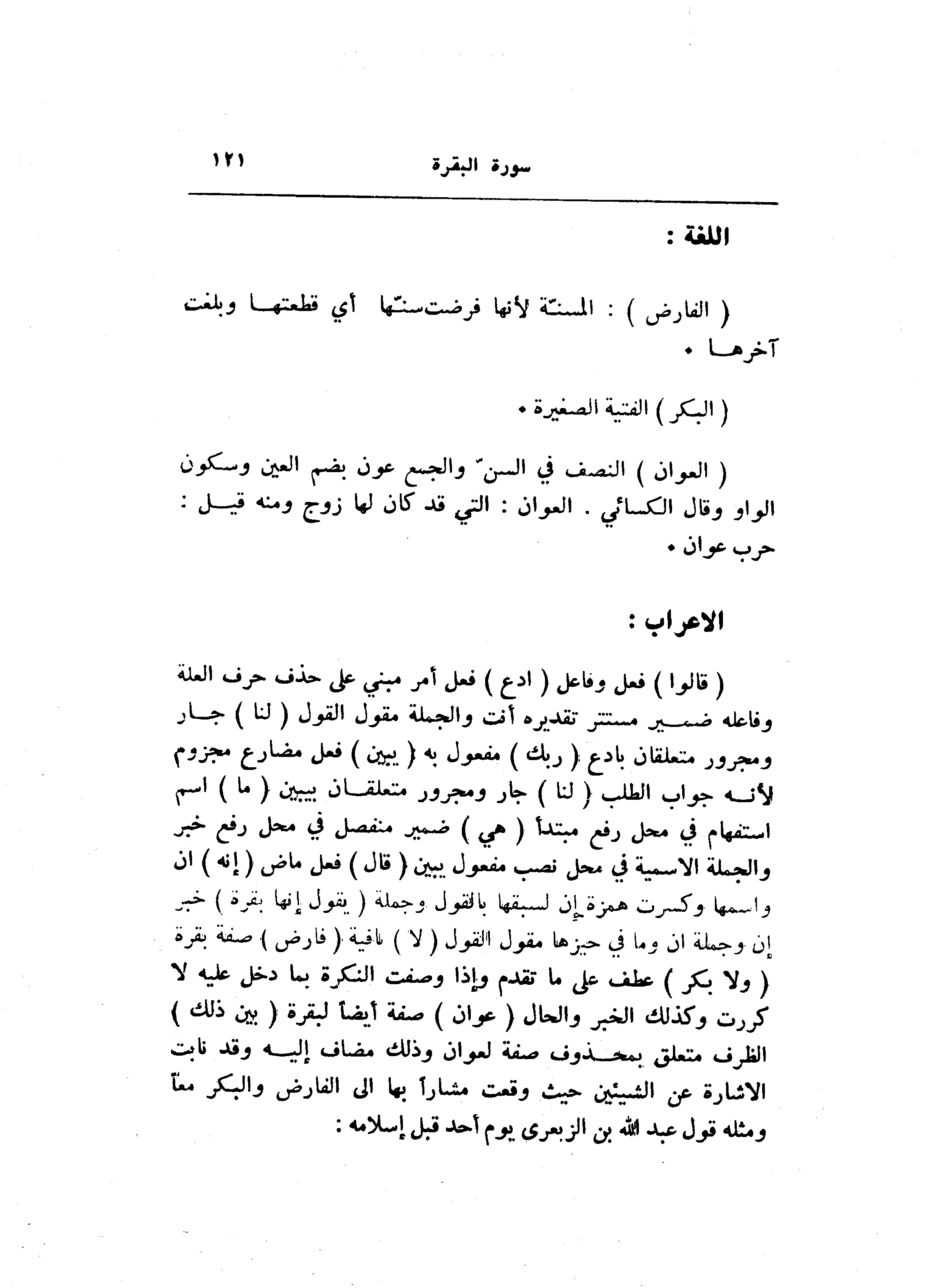 (قالُوا) فعل وفاعل (ادْعُ) فعل أمر مبني على حذف حرف العلة وفاعله ضمير مستتر تقديره أنت والجملة مقول القول (لَنا) جار ومجرور متعلقان بادع (رَبَّكَ) مفعول به (يُبَيِّنْ) فعل مضارع مجزوم لأنه جواب الطلب (لَنا) جار ومجرور متعلقان بيبين (ما) اسم استفهام في محل رفع مبتدأ (هِيَ) ضمير منفصل في محل رفع خبر والجملة الاسمية في محل نصب مفعول يبين (قالَ) فعل ماض (إِنَّهُ) ان واسمها وكسرت همزة إن لسبقها بالقول وجملة (يَقُولُ إِنَّها بَقَرَةٌ) خبر إن وجملة ان وما في حيزها مقول القول (لا) نافية (فارِضٌ) صفة بقرة (وَلا بِكْرٌ) عطف على ما تقدم وإذا وصفت النكرة بما دخل عليه لا كررت وكذلك الخبر والحال (عَوانٌ) صفة أيضا لبقرة (بَيْنَ ذلِكَ) الظرف متعلق بمحذوف صفة لعوان وذلك مضاف إليه وقد نابت الاشارة عن الشيئين حيث وقعت مشارا بها الى الفارض والبكر معا ومثله قول عبد الله بن الزبعرى يوم أحد قبل إسلامه:
