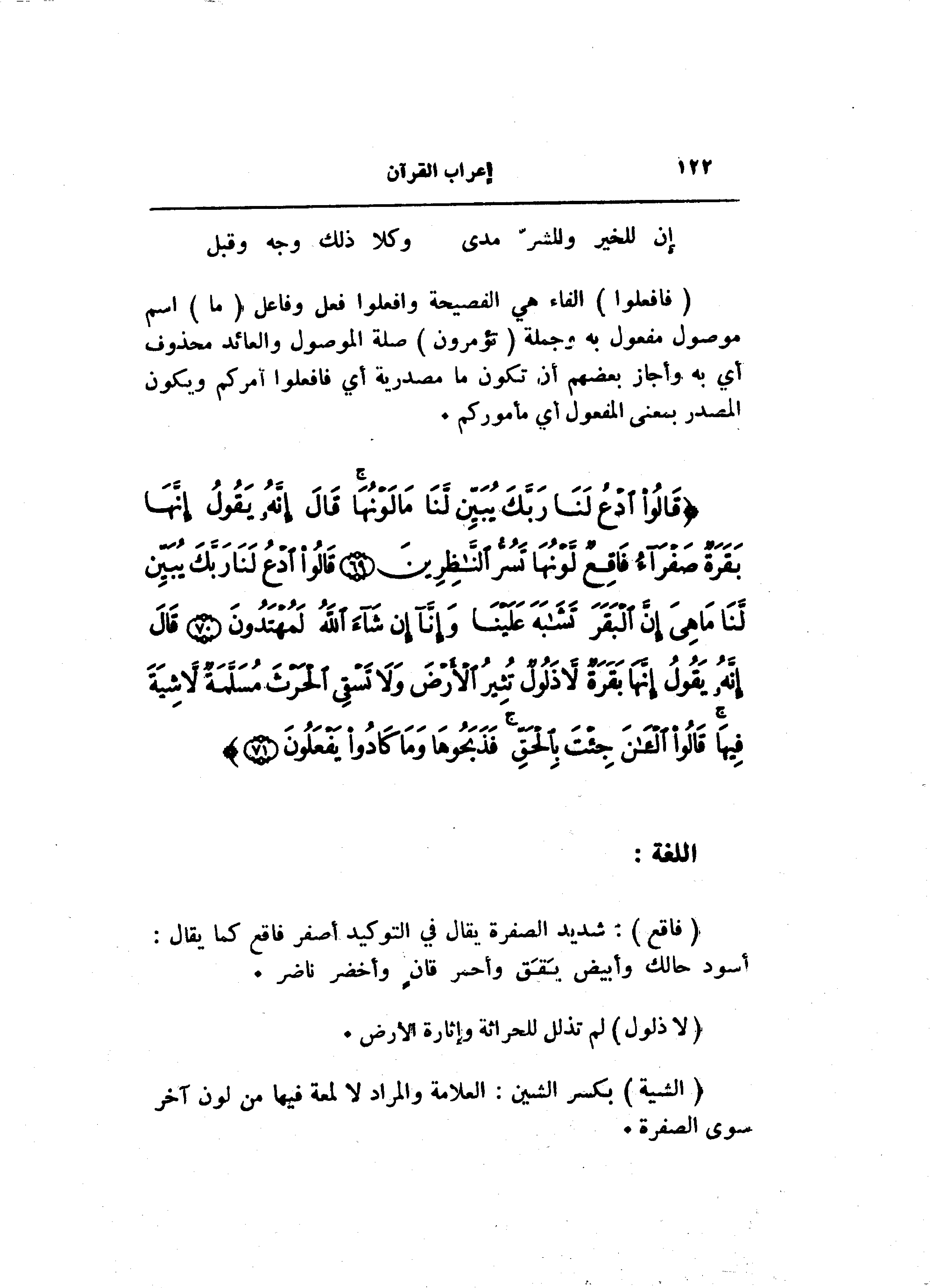 (فاقِعٌ) : شديد الصفرة يقال في التوكيد أصفر فاقع كما يقال: