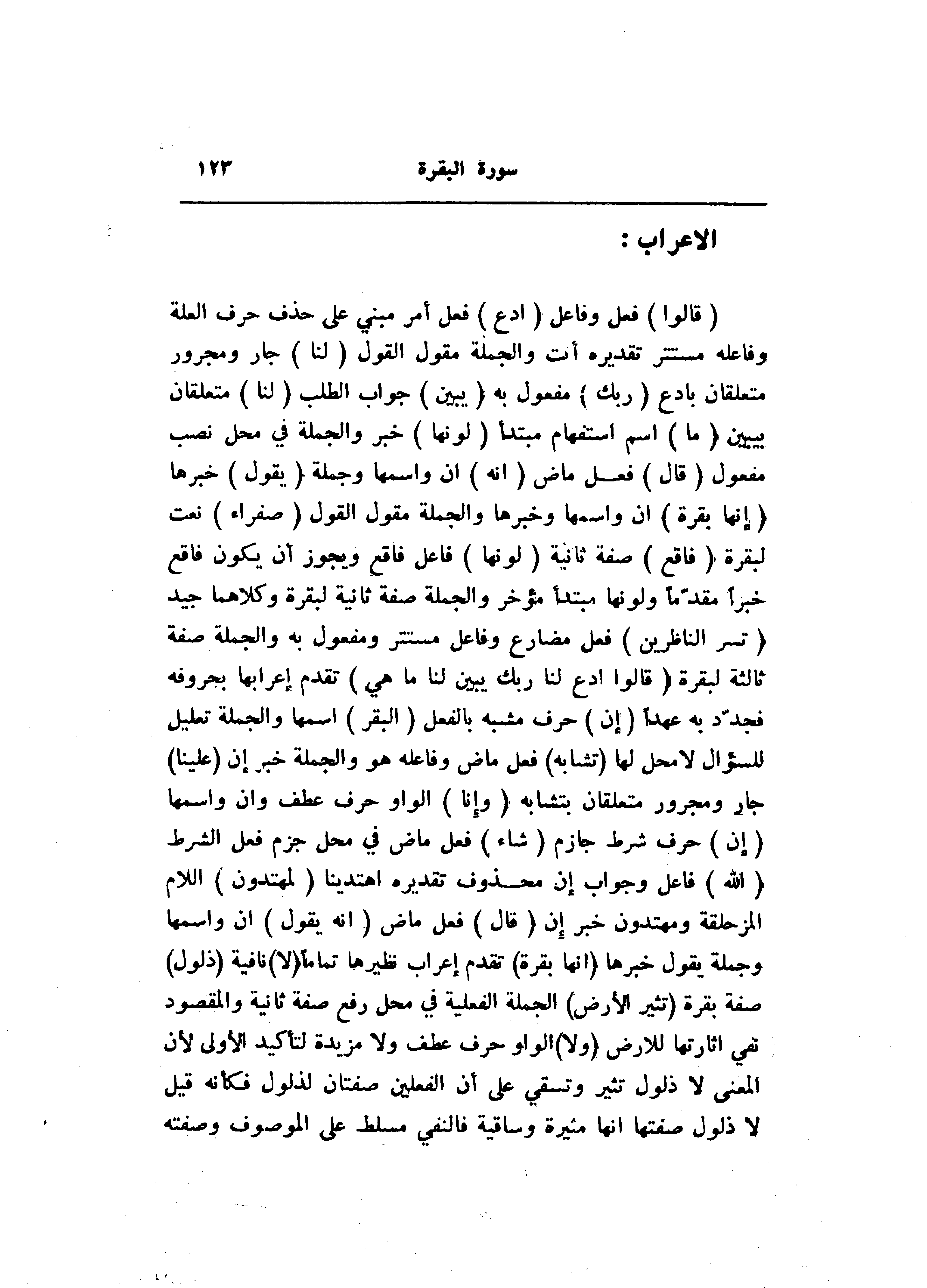 (قالُوا) فعل وفاعل (ادْعُ) فعل أمر مبني على حذف حرف العلة وفاعله مستتر تقديره أنت والجملة مقول القول (لَنا) جار ومجرور متعلقان بادع (رَبَّكَ) مفعول به (يُبَيِّنْ) جواب الطلب (لَنا) متعلقان بيبين (ما) اسم استفهام مبتدأ (لَوْنُها) خبر والجملة في محل نصب مفعول (قالَ) فعل ماض (إِنَّهُ) ان واسمها وجملة (يَقُولُ) خبرها (إِنَّها بَقَرَةٌ) ان واسمها وخبرها والجملة مقول القول (صَفْراءُ) نعت لبقرة (فاقِعٌ) صفة ثانية (لَوْنُها) فاعل فاقع ويجوز أن يكون فاقع خبرا مقدّما ولونها مبتدأ مؤخر والجملة صفة ثانية لبقرة وكلاهما جيد (تَسُرُّ النَّاظِرِينَ) فعل مضارع وفاعل مستتر ومفعول به والجملة صفة ثالثة لبقرة (قالُوا ادْعُ لَنا رَبَّكَ يُبَيِّنْ لَنا ما هِيَ) تقدم إعرابها بحروفه فجدّد به عهدا (إِنَّ) حرف مشبه بالفعل (الْبَقَرَ) اسمها والجملة تعليل للسؤال لا محل لها (تَشابَهَ) فعل ماض وفاعله هو والجملة خبر إن (عَلَيْنا) جار ومجرور متعلقان بتشابه (وَإِنَّا) الواو حرف عطف وان واسمها (إِنَّ) حرف شرط جازم (شاءَ) فعل ماض في محل جزم فعل الشرط (اللَّهُ) فاعل وجواب إن محذوف تقديره اهتدينا (لَمُهْتَدُونَ) اللام المزحلقة ومهتدون خبر إن (قالَ) فعل ماض (إِنَّهُ يَقُولُ) ان واسمها وجملة يقول خبرها (إِنَّها بَقَرَةٌ) تقدم إعراب نظيرها تماما (لا) نافية (ذَلُولٌ) صفة بقرة (تُثِيرُ الْأَرْضَ) الجملة الفعلية في محل رفع صفة ثانية والمقصود نفي اثارتها للارض (وَلا) الواو حرف عطف ولا مزيدة لتأكيد الأولى لأن المعنى لا ذلول تثير وتسقي على أن الفعلين صفتان لذلول فكأنه قيل لا ذلول صفتها انها مثيرة وساقية فالنفي مسلط على الموصوف وصفته