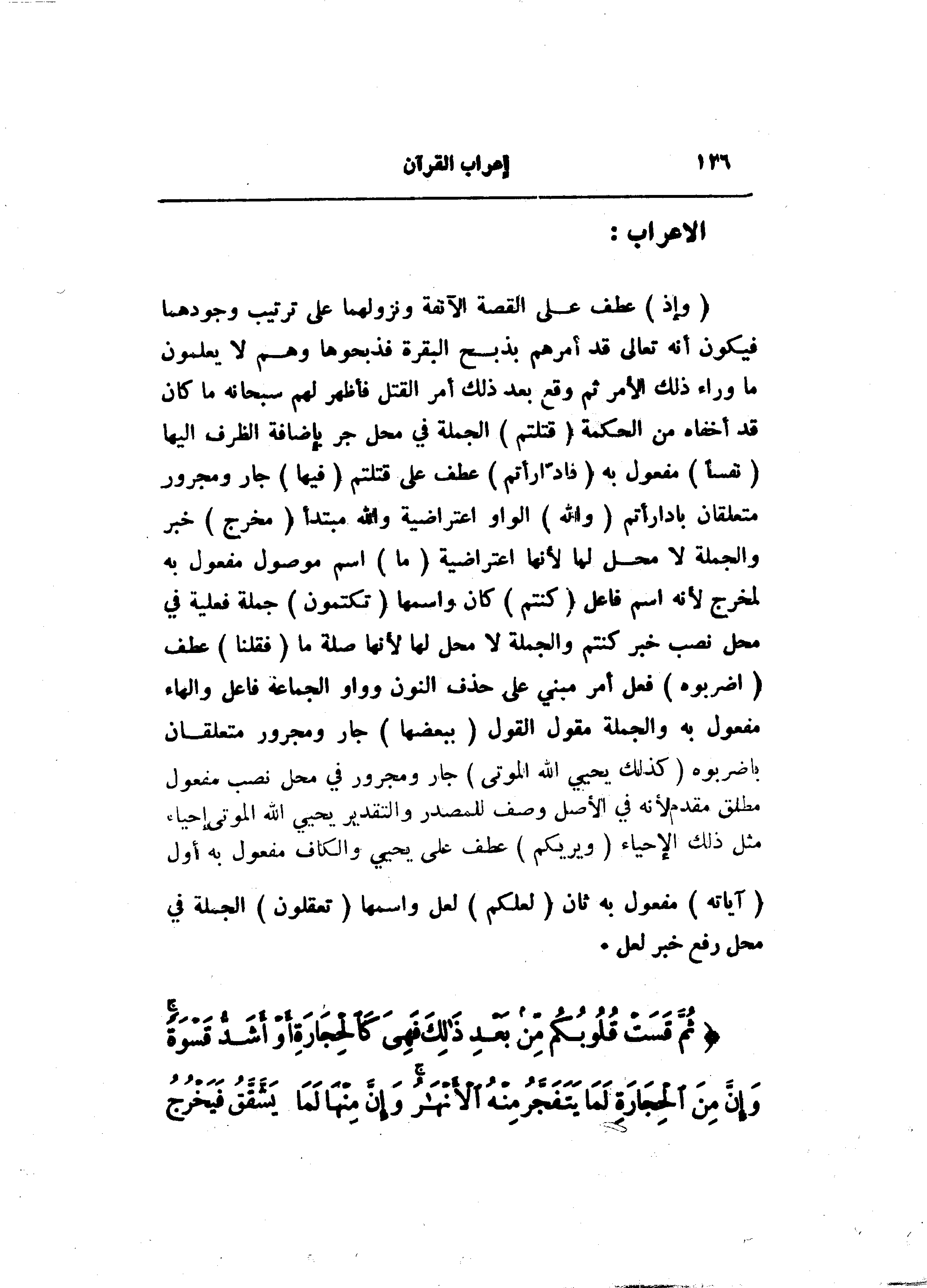 (وَإِذْ) عطف على القصة الآنفة ونزولهما على ترتيب وجودهما فيكون أنه تعالى قد أمرهم بذبح البقرة فذبحوها وهم لا يعلمون ما وراء ذلك الأمر ثم وقع بعد ذلك أمر القتل فأظهر لهم سبحانه ما كان قد أخفاه من الحكمة (قَتَلْتُمْ) الجملة في محل جر بإضافة الظرف إليها (نَفْساً) مفعول به (فَادَّارَأْتُمْ) عطف على قتلتم (فِيها) جار ومجرور متعلقان بادارأتم (وَاللَّهُ) الواو اعتراضية والله مبتدأ (مُخْرِجٌ) خبر والجملة لا محل لها لأنها اعتراضية (ما) اسم موصول مفعول به لمخرج لأنه اسم فاعل (كُنْتُمْ) كان واسمها (تَكْتُمُونَ) جملة فعلية في محل نصب خبر كنتم والجملة لا محل لها لأنها صلة ما (فَقُلْنا)