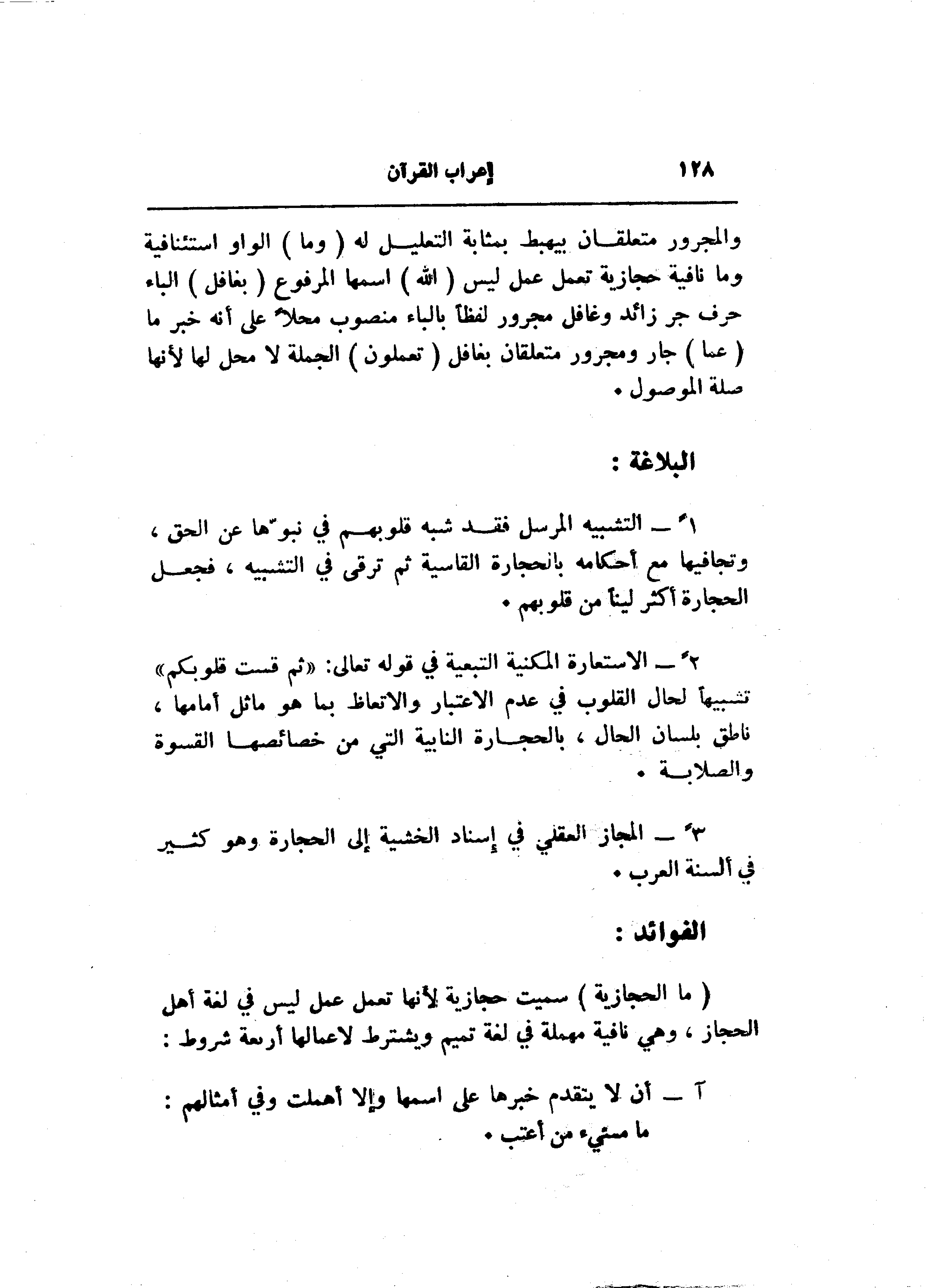 (ما الحجازية) سميت حجازية لأنها تعمل عمل ليس في لغة أهل الحجاز، وهي نافية مهملة في لغة تميم ويشترط لاعمالها أربعة شروط: