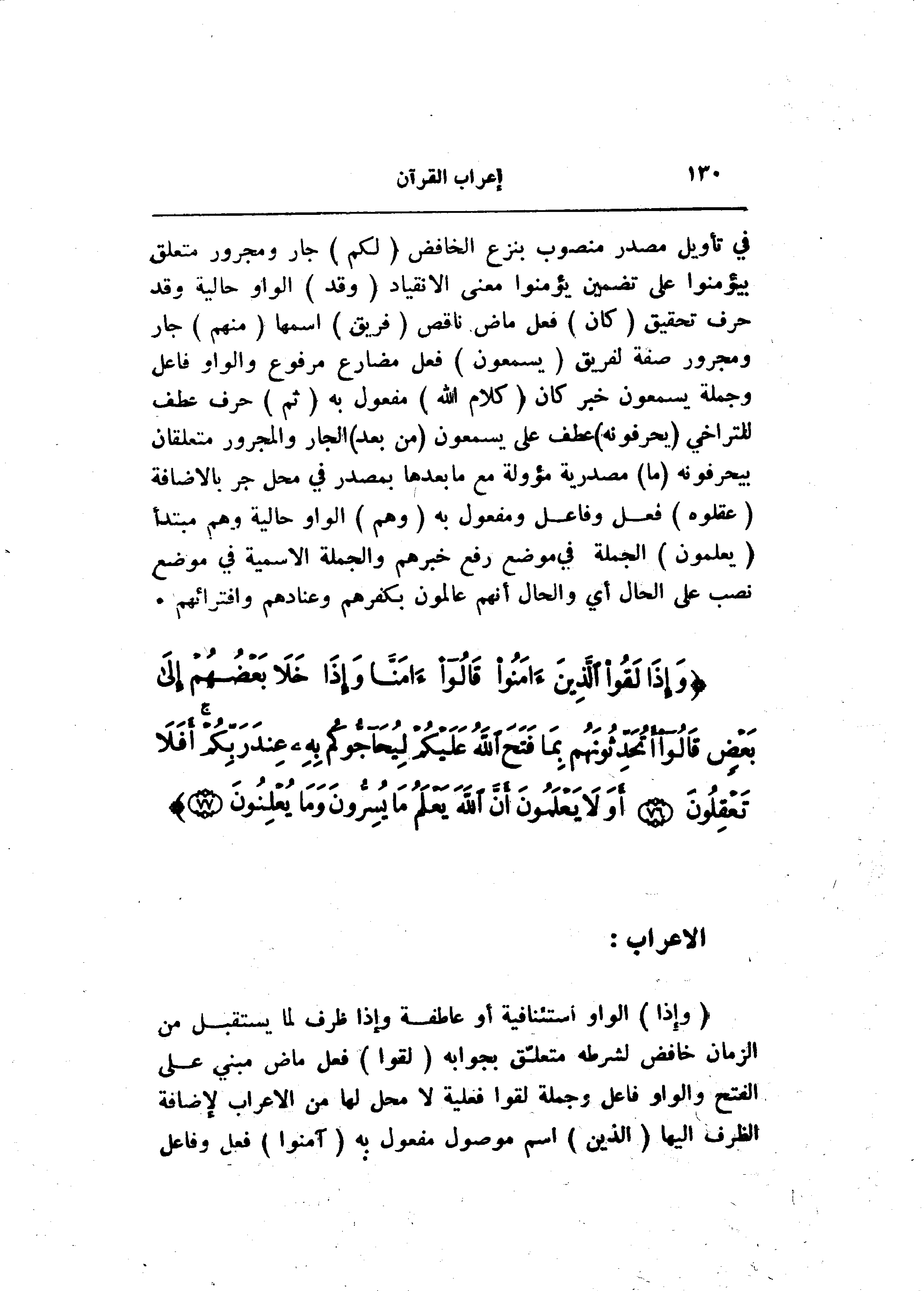 في تأويل مصدر منصوب بنزع الخافض (لَكُمْ) جار ومجرور متعلق بيؤمنوا على تضمين يؤمنوا معنى الانقياد (وَقَدْ) الواو حالية وقد حرف تحقيق (كانَ) فعل ماض ناقص (فَرِيقٌ) اسمها (مِنْهُمْ) جار ومجرور صفة لفريق (يَسْمَعُونَ) فعل مضارع مرفوع والواو فاعل وجملة يسمعون خبر كان (كَلامَ اللَّهِ) مفعول به (ثُمَّ) حرف عطف للتراخي (يُحَرِّفُونَهُ) عطف على يسمعون (مِنْ بَعْدِ) الجار والمجرور متعلقان بيحرفونه (ما) مصدرية مؤولة مع ما بعدها بمصدر في محل جر بالاضافة (عَقَلُوهُ) فعل وفاعل ومفعول به (وَهُمْ) الواو حالية وهم مبتدأ (يَعْلَمُونَ) الجملة في موضع رفع خبرهم والجملة الاسمية في موضع نصب على الحال أي والحال أنهم عالمون بكفرهم وعنادهم وافترائهم.