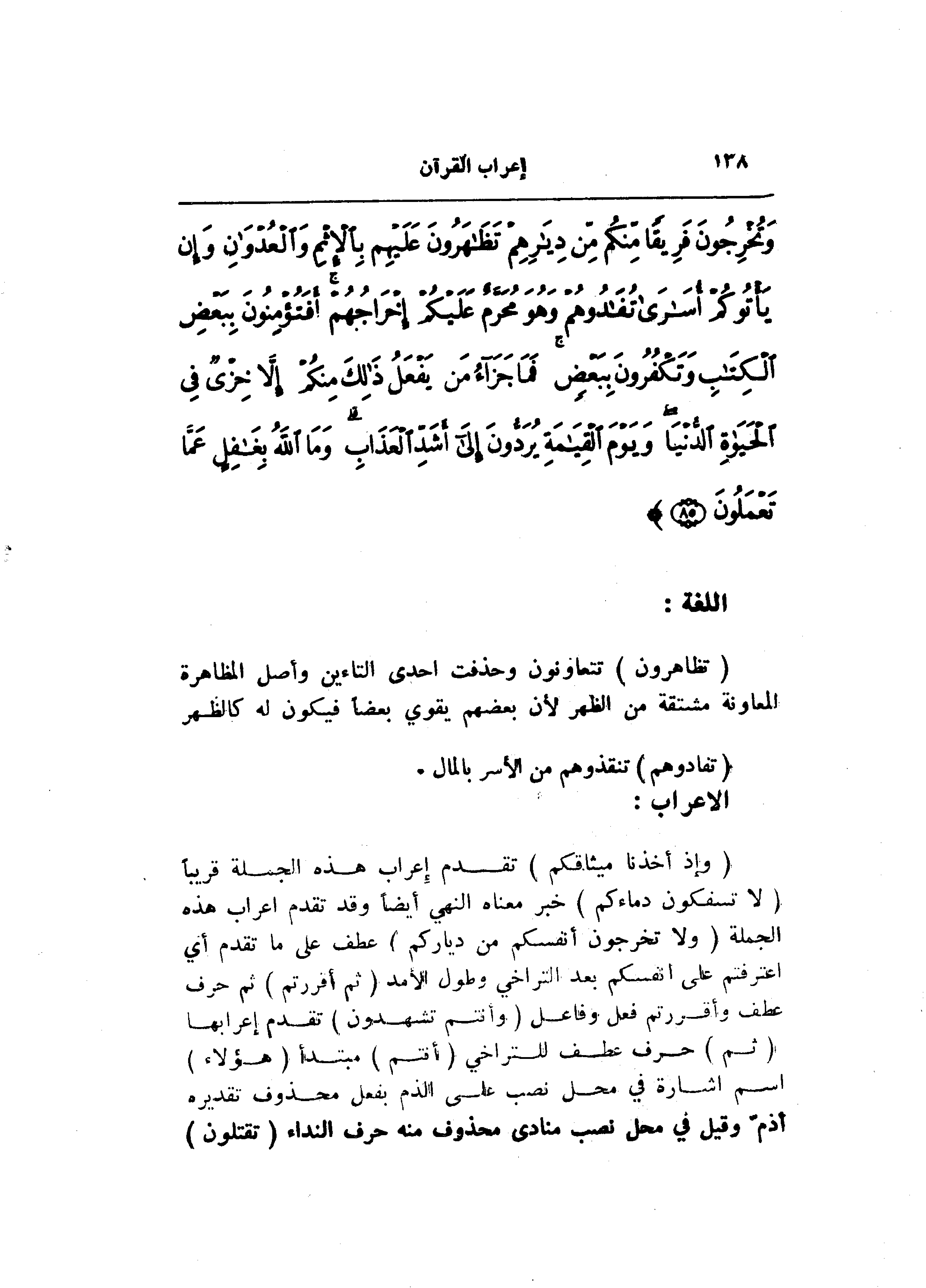 (تَظاهَرُونَ) تتعاونون وحذفت احدى التاءين وأصل المظاهرة المعاونة مشتقة من الظهر لأن بعضهم يقوي بعضا فيكون له كالظهر (تُفادُوهُمْ) تنقذوهم من الأسر بالمال.