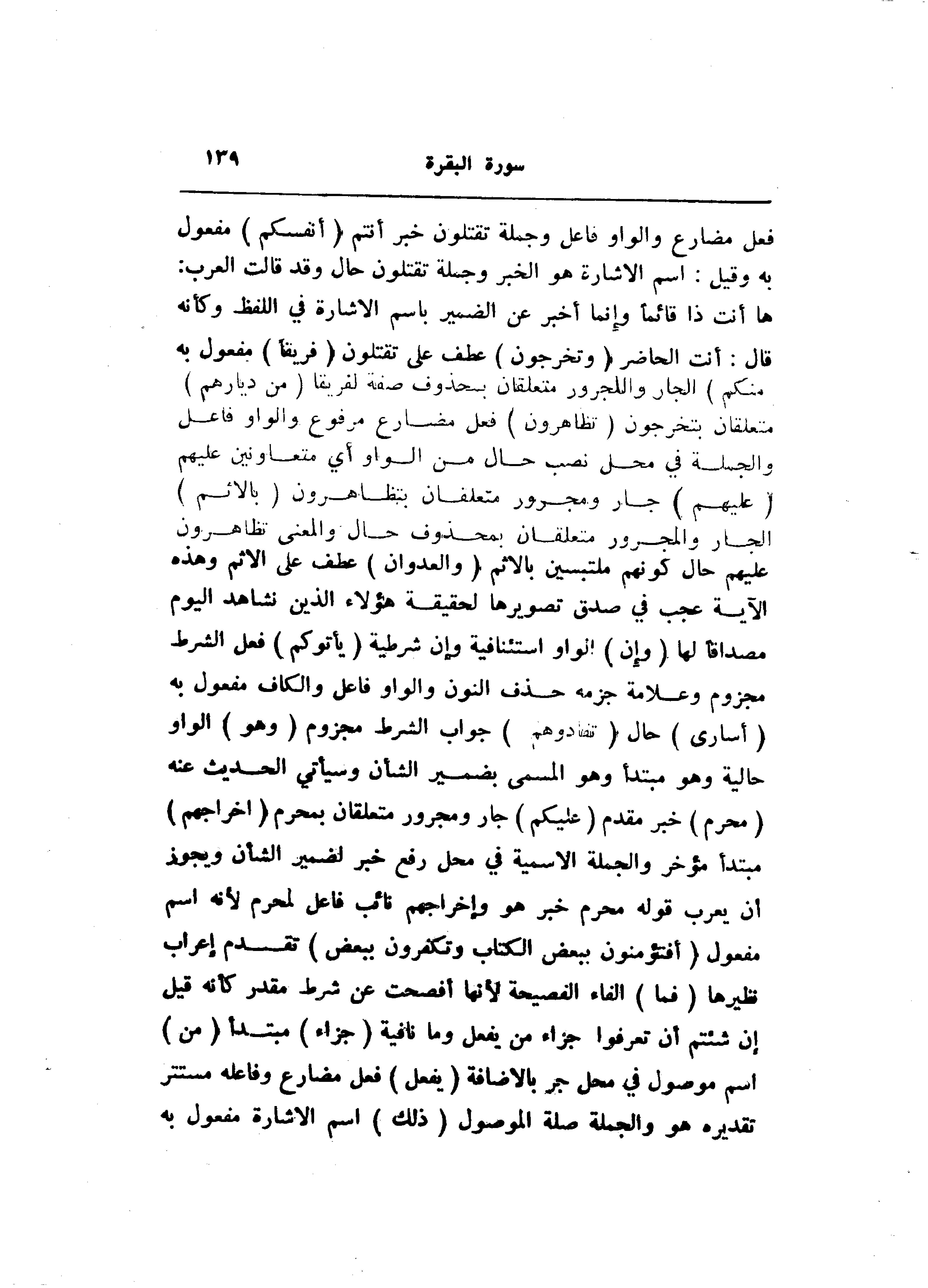 ها أنت ذا قائما وإنما أخبر عن الضمير باسم الاشارة في اللفظ وكأنه قال: أنت الحاضر (وَتُخْرِجُونَ) عطف على تقتلون (فَرِيقاً) مفعول به (مِنْكُمْ) الجار والمجرور متعلقان بمحذوف صفة لفريقا (مِنْ دِيارِهِمْ) متعلقان بتخرجون (تَظاهَرُونَ) فعل مضارع مرفوع والواو فاعل والجملة في محل نصب حال من الواو أي متعاونين عليهم (عَلَيْهِمْ) جار ومجرور متعلقان بتظاهرون (بِالْإِثْمِ) الجار والمجرور متعلقان بمحذوف حال والمعنى تظاهرون عليهم حال كونهم ملتبسين بالإثم (وَالْعُدْوانِ) عطف على الإثم وهذه الآية عجب في صدق تصويرها لحقيقة هؤلاء الذين نشاهد اليوم مصداقا لها (وَإِنْ) الواو استئنافية وإن شرطية (يَأْتُوكُمْ) فعل الشرط مجزوم وعلامة جزمه حذف النون والواو فاعل والكاف مفعول به (أُسارى) حال (تُفادُوهُمْ) جواب الشرط مجزوم (وَهُوَ) الواو حالية وهو مبتدأ وهو المسمى بضمير الشأن وسيأتي الحديث عنه (مُحَرَّمٌ) خبر مقدم (عَلَيْكُمْ) جار ومجرور متعلقان بمحرم (إِخْراجُهُمْ) مبتدأ مؤخر والجملة الاسمية في محل رفع خبر لضمير الشأن ويجوز أن يعرب قوله محرم خبر هو وإخراجهم نائب فاعل لمحرم لأنه اسم مفعول (أَفَتُؤْمِنُونَ بِبَعْضِ الْكِتابِ وَتَكْفُرُونَ بِبَعْضٍ) تقدم إعراب نظيرها (فَما) الفاء الفصيحة لأنها أفصحت عن شرط مقدر كأنه قيل إن شئتم أن تعرفوا جزاء من يفعل وما نافية (جَزاءُ) مبتدأ (مِنْ) اسم موصول في محل جر بالاضافة (يَفْعَلُ) فعل مضارع وفاعله مستتر تقديره هو والجملة صلة الموصول (ذلِكَ) اسم الاشارة مفعول به
