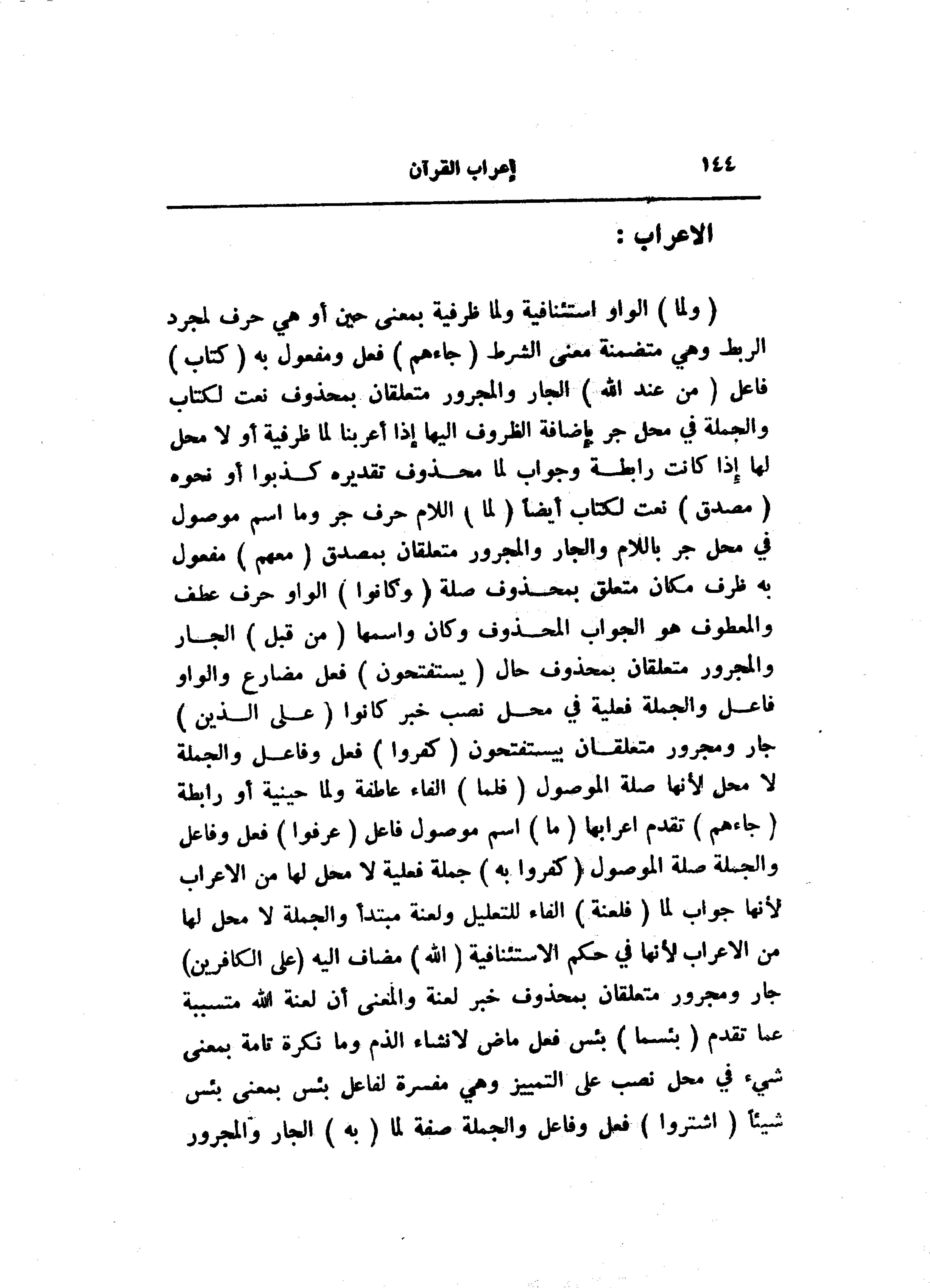 (وَلَمَّا) الواو استئنافية ولما ظرفية بمعنى حين أو هي حرف لمجرد الربط وهي متضمنة معنى الشرط (جاءَهُمْ) فعل ومفعول به (كِتابٌ) فاعل (مِنْ عِنْدِ اللَّهِ) الجار والمجرور متعلقان بمحذوف نعت لكتاب والجملة في محل جر بإضافة الظروف إليها إذا أعربنا لما ظرفية أو لا محل لها إذا كانت رابطة وجواب لما محذوف تقديره كذبوا أو نحوه (مُصَدِّقٌ) نعت لكتاب أيضا (لَمَّا) اللام حرف جر وما اسم موصول في محل جر باللام والجار والمجرور متعلقان بمصدق (مَعَهُمْ) مفعول به ظرف مكان متعلق بمحذوف صلة (وَكانُوا) الواو حرف عطف والمعطوف هو الجواب المحذوف وكان واسمها (مِنْ قَبْلُ) الجار والمجرور متعلقان بمحذوف حال (يَسْتَفْتِحُونَ) فعل مضارع والواو فاعل والجملة فعلية في محل نصب خبر كانوا (عَلَى الَّذِينَ) جار ومجرور متعلقان بيستفتحون (كَفَرُوا) فعل وفاعل والجملة لا محل لأنها صلة الموصول (فَلَمَّا) الفاء عاطفة ولما حينية أو رابطة (جاءَهُمْ) تقدم اعرابها (ما) اسم موصول فاعل (عَرَفُوا) فعل وفاعل والجملة صلة الموصول (كَفَرُوا بِهِ) جملة فعلية لا محل لها من الإعراب لأنها جواب لما (فَلَعْنَةُ) الفاء للتعليل ولعنة مبتدأ والجملة لا محل لها من الإعراب لأنها في حكم الاستئنافية (اللَّهِ) مضاف اليه (عَلَى الْكافِرِينَ)
