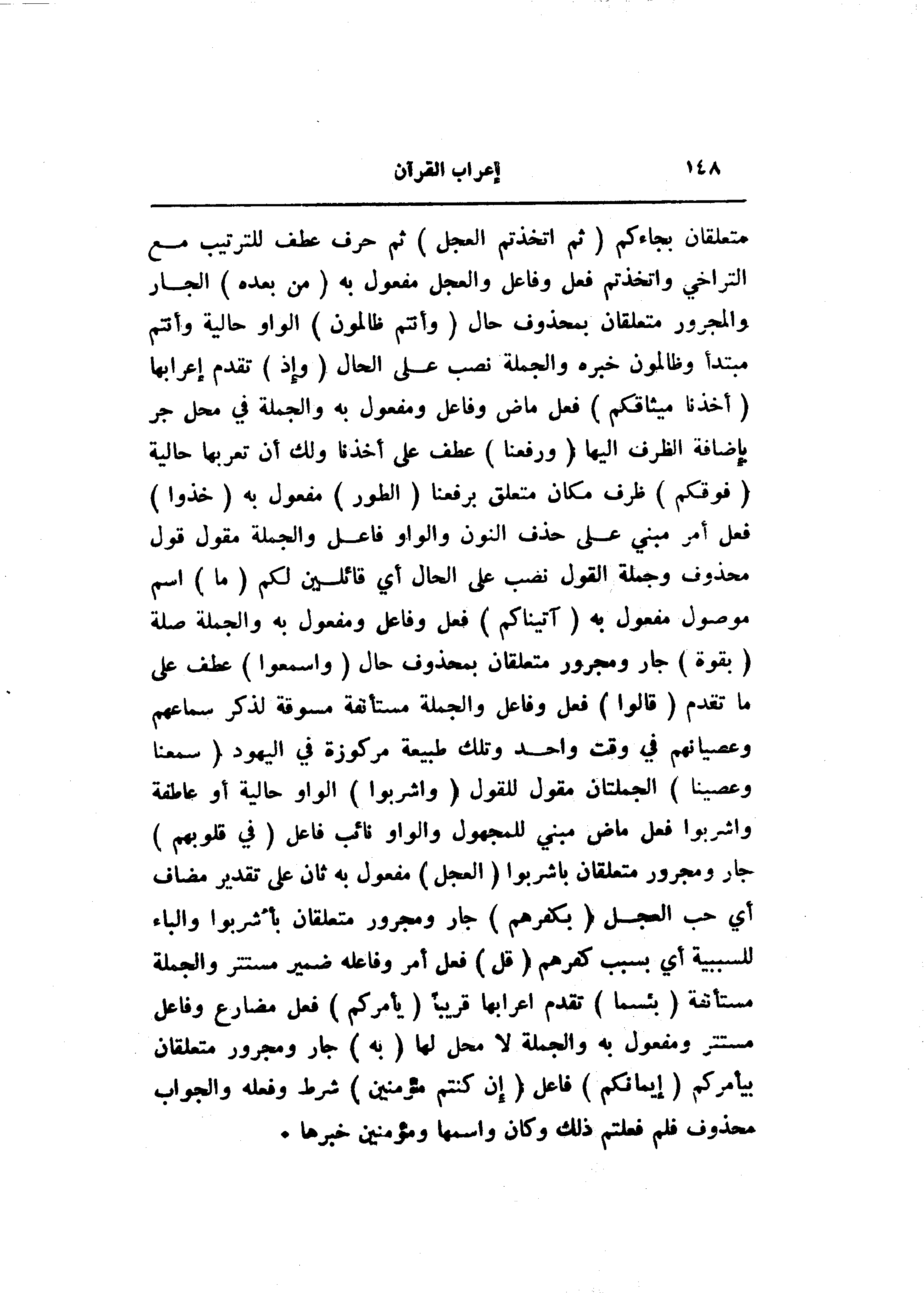 متعلقان بجاءكم (ثُمَّ اتَّخَذْتُمُ الْعِجْلَ) ثم حرف عطف للترتيب مع التراخي واتخذتم فعل وفاعل والعجل مفعول به (مِنْ بَعْدِهِ) الجار والمجرور متعلقان بمحذوف حال (وَأَنْتُمْ ظالِمُونَ) الواو حالية وأنتم مبتدأ وظالمون خبره والجملة نصب على الحال (وَإِذْ) تقدم إعرابها (أَخَذْنا مِيثاقَكُمْ) فعل ماض وفاعل ومفعول به والجملة في محل جر بإضافة الظرف إليها (وَرَفَعْنا) عطف على أخذنا ولك أن تعربها حالية (فَوْقَكُمُ) ظرف مكان متعلق برفعنا (الطُّورَ) مفعول به (خُذُوا) فعل أمر مبني على حذف النون والواو فاعل والجملة مقول قول محذوف وجملة القول نصب على الحال أي قائلين لكم (ما) اسم موصول مفعول به (آتَيْناكُمْ) فعل وفاعل ومفعول به والجملة صلة (بِقُوَّةٍ) جار ومجرور متعلقان بمحذوف حال (وَاسْمَعُوا) عطف على ما تقدم (قالُوا) فعل وفاعل والجملة مستأنفة مسوقة لذكر سماعهم وعصيانهم في وقت واحد وتلك طبيعة مركوزة في اليهود (سَمِعْنا وَعَصَيْنا) الجملتان مقول للقول (وَأُشْرِبُوا) الواو حالية أو عاطفة واشربوا فعل ماض مبني للمجهول والواو نائب فاعل (فِي قُلُوبِهِمُ) جار ومجرور متعلقان باشربوا (الْعِجْلَ) مفعول به ثان على تقدير مضاف أي حب العجل (بِكُفْرِهِمْ) جار ومجرور متعلقان بأشربوا والباء للسببية أي بسبب كفرهم (قُلْ) فعل أمر وفاعله ضمير مستتر والجملة مستأنفة (بِئْسَما) تقدم اعرابها قريبا (يَأْمُرُكُمْ) فعل مضارع وفاعل مستتر ومفعول به والجملة لا محل لها (بِهِ) جار ومجرور متعلقان بيأمركم (إِيمانُكُمْ) فاعل (إِنْ كُنْتُمْ مُؤْمِنِينَ) شرط وفعله والجواب محذوف فلم فعلتم ذلك وكان واسمها ومؤمنين خبرها.