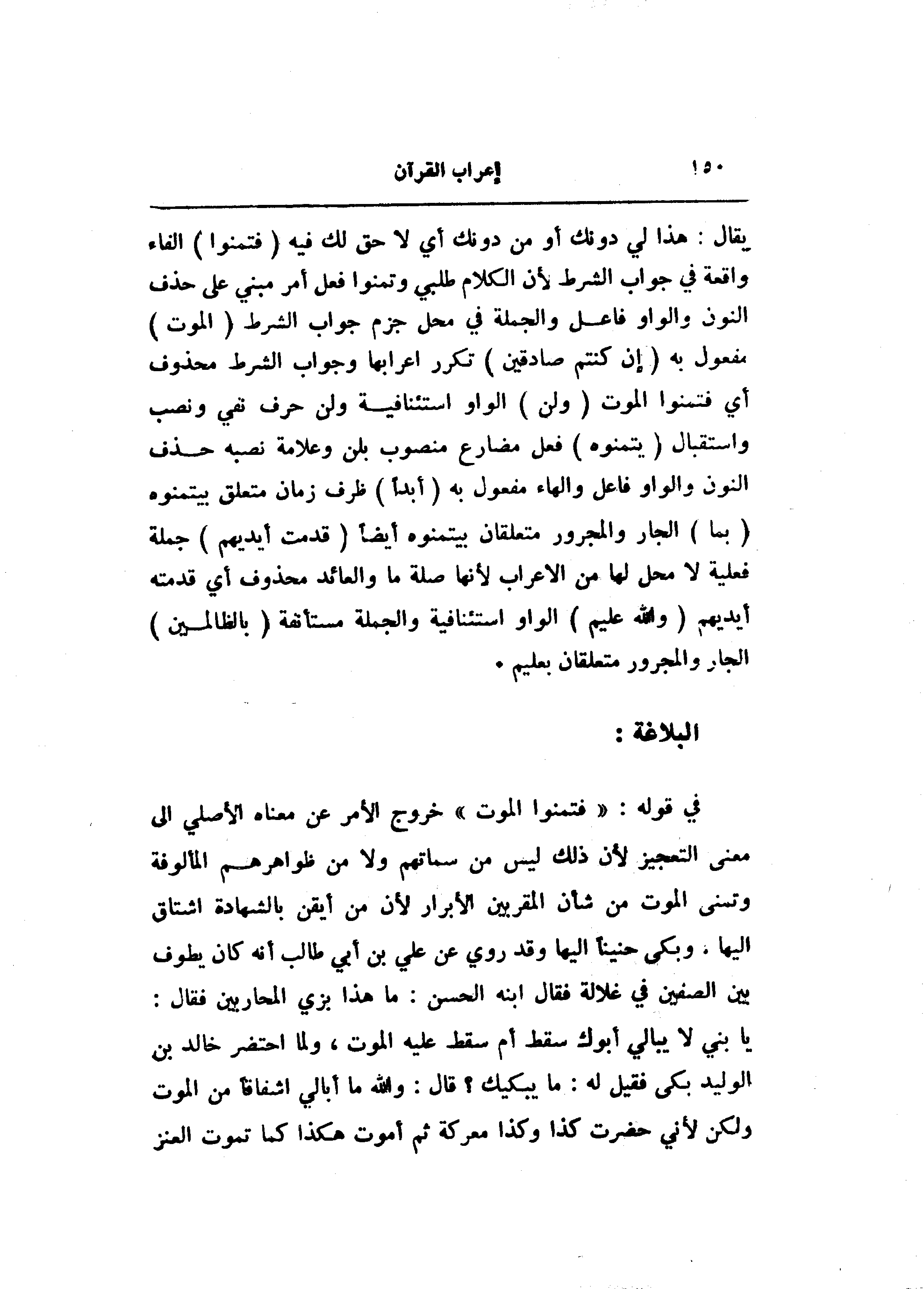 في قوله: «فتمنوا الموت» خروج الأمر عن معناه الأصلي الى معنى التعجيز لأن ذلك ليس من سماتهم ولا من ظواهرهم المألوفة وتمنى الموت من شأن المقربين الأبرار لأن من أيقن بالشهادة اشتاق إليها. وبكى حنينا إليها وقد روي عن علي بن أبي طالب أنه كان يطوف بين الصفين في غلالة فقال ابنه الحسن: ما هذا بزي المحاربين فقال: