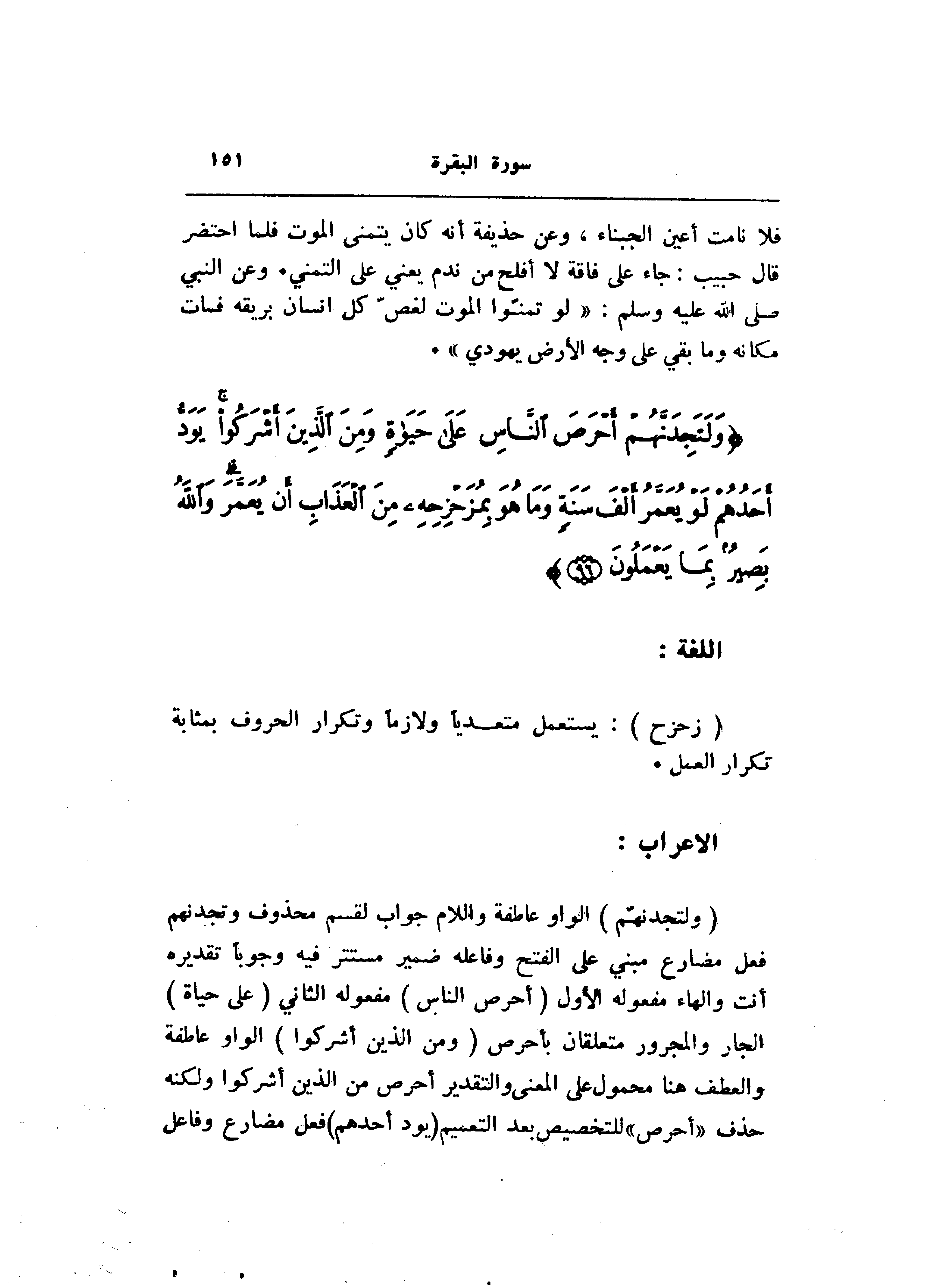 (وَلَتَجِدَنَّهُمْ) الواو عاطفة واللام جواب لقسم محذوف وتجدنهم فعل مضارع مبني على الفتح وفاعله ضمير مستتر فيه وجوبا تقديره أنت والهاء مفعوله الأول (أَحْرَصَ النَّاسِ) مفعوله الثاني (عَلى حَياةٍ) الجار والمجرور متعلقان بأحرص (وَمِنَ الَّذِينَ أَشْرَكُوا) الواو عاطفة والعطف هنا محمول على المعنى والتقدير أحرص من الذين أشركوا ولكنه حذف «أحرص» للتخصيص بعد التعميم (يَوَدُّ أَحَدُهُمْ) فعل مضارع وفاعل