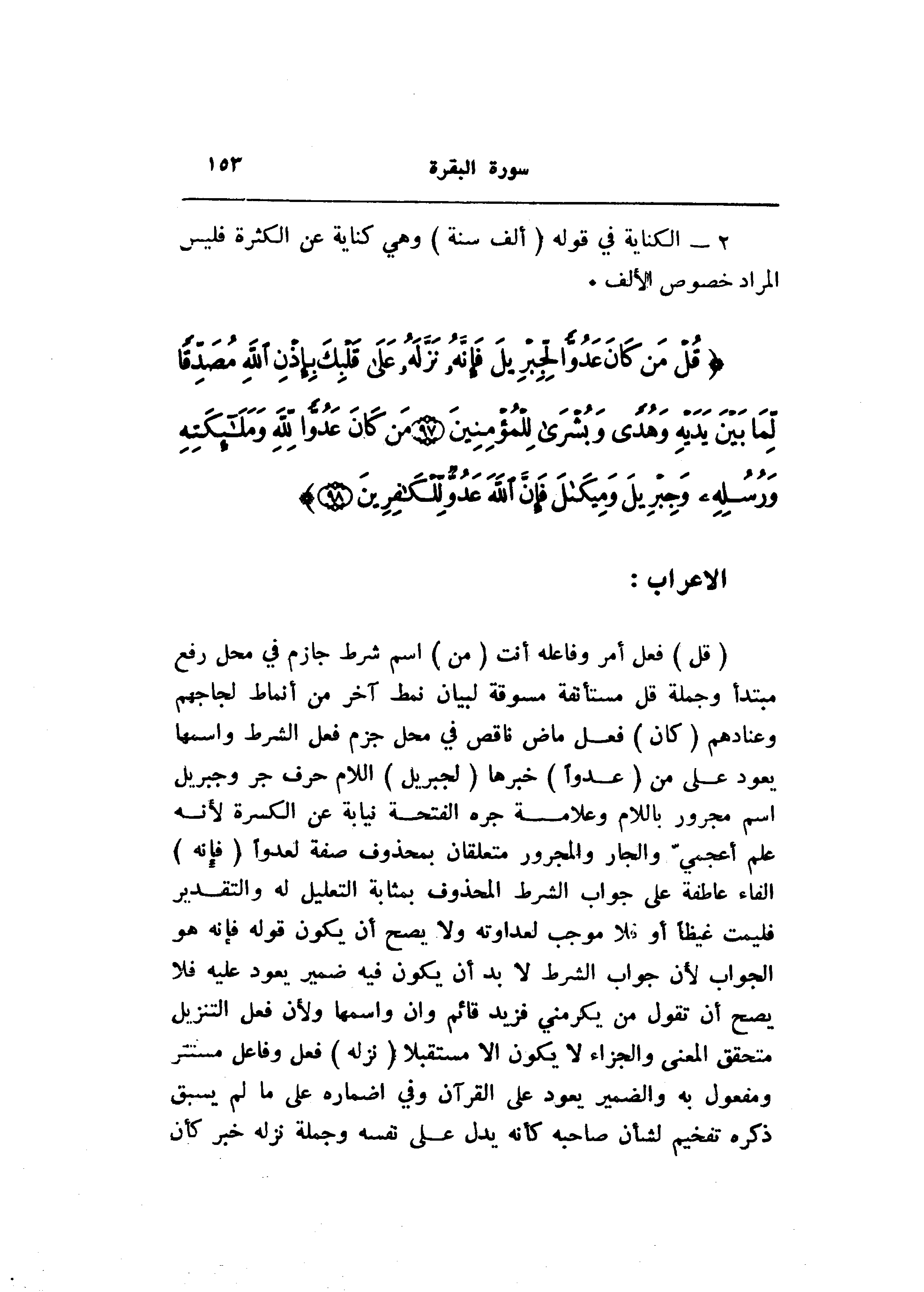 (قُلْ) فعل أمر وفاعله أنت (مَنْ) اسم شرط جازم في محل رفع مبتدأ وجملة قل مستأنفة مسوقة لبيان نمط آخر من أنماط لجاجهم وعنادهم (كانَ) فعل ماض ناقص في محل جزم فعل الشرط واسمها يعود على من (عَدُوًّا) خبرها (لِجِبْرِيلَ) اللام حرف جر وجبريل اسم مجرور باللام وعلامة جره الفتحة نيابة عن الكسرة لأنه علم أعجميّ والجار والمجرور متعلقان بمحذوف صفة لعدوا (فَإِنَّهُ) الفاء عاطفة على جواب الشرط المحذوف بمثابة التعليل له والتقدير فليمت غيظا أو فلا موجب لعداوته ولا يصح أن يكون قوله فإنه هو الجواب لأن جواب الشرط لا بد أن يكون فيه ضمير يعود عليه فلا يصح أن تقول من يكرمني فزيد قائم وان واسمها ولأن فعل التنزيل متحقق المعنى والجزاء لا يكون الا مستقبلا (نَزَّلَهُ) فعل وفاعل مستتر ومفعول به والضمير يعود على القرآن وفي إضماره على ما لم يسبق ذكره تفخيم لشأن صاحبه كأنه يدل على نفسه وجملة نزله خبر كأن