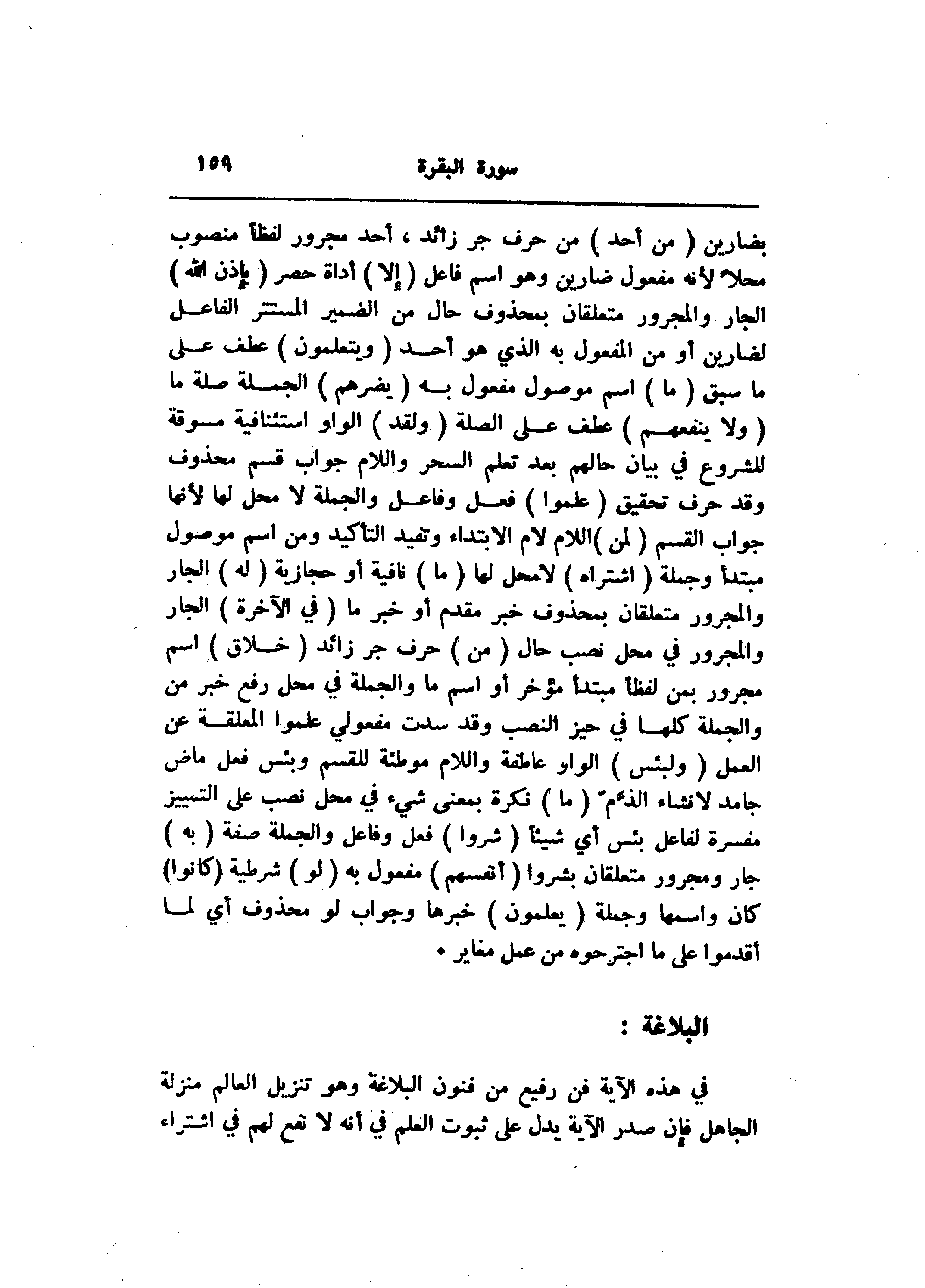 بضارين (مِنْ أَحَدٍ) من حرف جر زائد، أحد مجرور لفظا منصوب محلا لأنه مفعول ضارين وهو اسم فاعل (إِلَّا) أداة حصر (بِإِذْنِ اللَّهِ) الجار والمجرور متعلقان بمحذوف حال من الضمير المستتر الفاعل لضارين أو من المفعول به الذي هو أحد (وَيَتَعَلَّمُونَ) عطف على ما سبق (ما) اسم موصول مفعول به (يَضُرُّهُمْ) الجملة صلة ما (وَلا يَنْفَعُهُمْ) عطف على الصلة (وَلَقَدْ) الواو استئنافية مسوقة للشروع في بيان حالهم بعد تعلم السحر واللام جواب قسم محذوف وقد حرف تحقيق (عَلِمُوا) فعل وفاعل والجملة لا محل لها لأنها جواب القسم (لَمَنِ) اللام لام الابتداء وتفيد التأكيد ومن اسم موصول مبتدأ وجملة (اشْتَراهُ) لا محل لها (ما) نافية أو حجازية (لَهُ) الجار والمجرور متعلقان بمحذوف خبر مقدم أو خبر ما (فِي الْآخِرَةِ) الجار والمجرور في محل نصب حال (مِنْ) حرف جر زائد (خَلاقٍ) اسم مجرور بمن لفظا مبتدأ مؤخر أو اسم ما والجملة في محل رفع خبر من والجملة كلها في حيز النصب وقد سدت مفعولي علموا المعلقة عن العمل (وَلَبِئْسَ) الواو عاطفة واللام موطئة للقسم وبئس فعل ماض جامد لانشاء الذّمّ (ما) نكرة بمعنى شيء في محل نصب على التمييز مفسرة لفاعل بئس أي شيئا (شَرَوْا) فعل وفاعل والجملة صفة (بِهِ) جار ومجرور متعلقان بشروا (أَنْفُسَهُمْ) مفعول به (لَوْ) شرطية (كانُوا) كان واسمها وجملة (يُعَلِّمُونَ) خبرها وجواب لو محذوف أي لما أقدموا على ما اجترحوه من عمل مغاير.