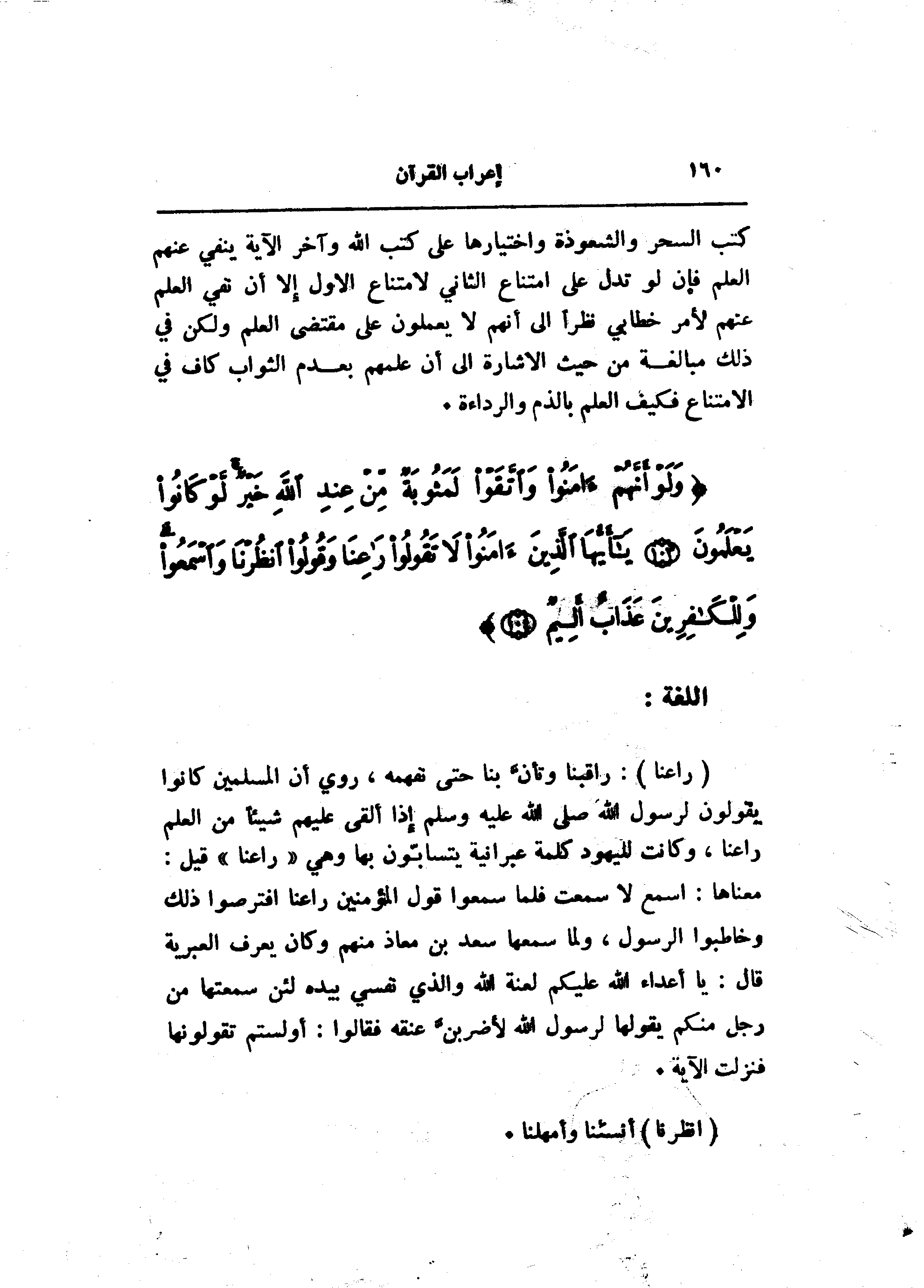 (راعِنا) : راقبنا وتأنّ بنا حتى نفهمه، روي أن المسلمين كانوا يقولون لرسول الله صلى الله عليه وسلم إذا ألقى عليهم شيئا من العلم راعنا، وكانت لليهود كلمة عبرانية يتسابّون بها وهي «راعنا» قيل: