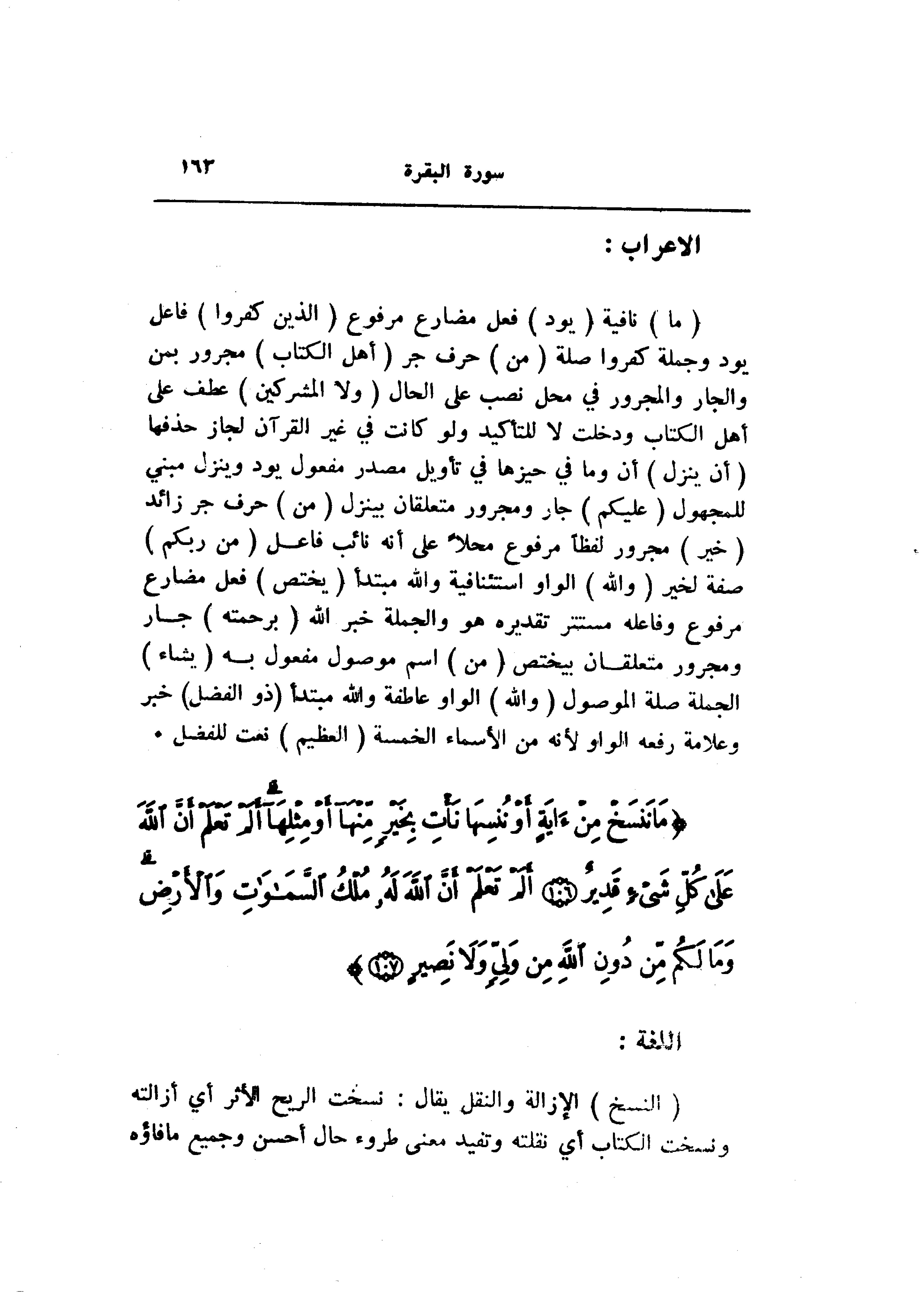 (ما) نافية (يَوَدُّ) فعل مضارع مرفوع (الَّذِينَ كَفَرُوا) فاعل يود وجملة كفروا صلة (مِنْ) حرف جر (أَهْلِ الْكِتابِ) مجرور بمن والجار والمجرور في محل نصب على الحال (وَلَا الْمُشْرِكِينَ) عطف على أهل الكتاب ودخلت لا للتأكيد ولو كانت في غير القرآن لجاز حذفها (أَنْ يُنَزَّلَ) أن وما في حيزها في تأويل مصدر مفعول يود وينزل مبني للمجهول (عَلَيْكُمْ) جار ومجرور متعلقان بينزل (مِنْ) حرف جر زائد (خَيْرٍ) مجرور لفظا مرفوع محلا على أنه نائب فاعل (مِنْ رَبِّكُمْ) صفة لخير (وَاللَّهُ) الواو استئنافية والله مبتدأ (يَخْتَصُّ) فعل مضارع مرفوع وفاعله مستتر تقديره هو والجملة خبر الله (بِرَحْمَتِهِ) جار ومجرور متعلقان بيختص (مِنْ) اسم موصول مفعول به (يَشاءُ) الجملة صلة الموصول (وَاللَّهُ) الواو عاطفة والله مبتدأ (ذُو الْفَضْلِ) خبر وعلامة رفعه الواو لأنه من الأسماء الخمسة (الْعَظِيمِ) نعت للفضل.